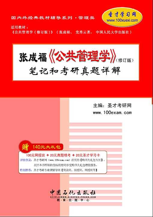 圣才考研网提供张成福、党秀云《公共管理学》等国内外经典教材名师讲堂、各种管理类考试辅导方案,并精心制作了面授班与网授班的全套授课光盘。购书享受大礼包增值服务【100元网授班+20元真题模考+20元圣才学习卡】。