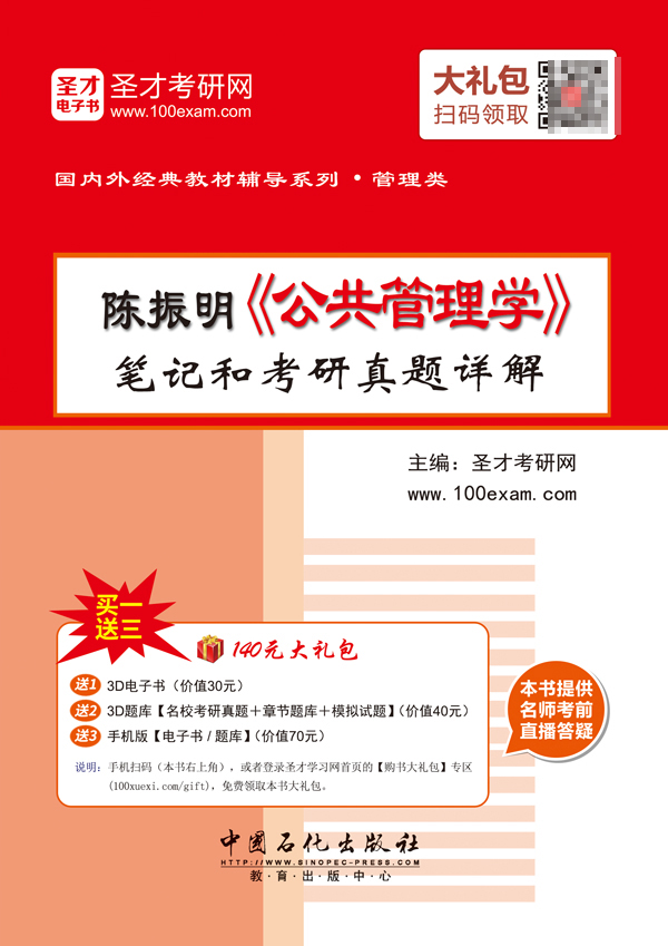 圣才考研网(www.100xuexi.com)提供陈振明《公共管理学》网授精讲班【教材精讲+考研真题串讲】、3D电子书、3D题库。购书享受大礼包增值服务【30元3D电子书+40元3D题库+70元手机版电子书/题库】。本书提供名师考前直播答疑,手机电脑均可观看,直播答疑在考前推出(具体时间见网站公告)。手机扫码(本书封面的二维码),或者登录圣才学习网首页的【购书大礼包】专区(www.100xuexi.com/gift),免费领取本书大礼包。