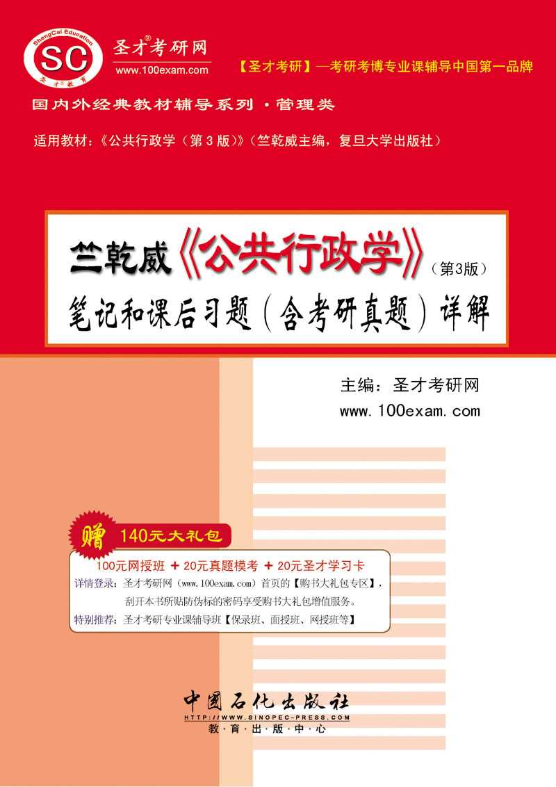 国内外经典教材辅导系列是一套全面解析当前国内外各大院校权威教科书的辅导资料。我国各大院校一般都把国内外通用的权威教科书作为本科生和研究生学习专业课程的参考教材,这些教材甚至被很多考试(特别是硕士和博士研究生入学考试)和培训项目作为指定参考书。这些国内外优秀教材的内容一般都有一定的广度和深度,但其课(章)后习题一般没有答案或者答案简单,这给广大读者学习专业教材带来了一定的困难。为了帮助读者更好地学习专业课,我们有针对性地编著了一套适用于国内外教材的学习资料,整理了各章的笔记和课(章)后习题,精选了部分名校近年的考研真题,并提供了详细的参考答案。 竺乾威主编的《公共行政学》是我国高校采用较多的公共行政学权威教材之一。作为该教材的学习辅导书,本书具有以下几个方面的特点: 1.整理名校笔记,浓缩内容精华。本书每章的复习笔记均对该章的重难点进行了整理,并参考了国内名校名师讲授该教材的课堂笔记。因此,本书的内容几乎浓缩了该教材的所有知识精华。 2.解析课后习题,提供详尽答案。本书参考大量公共行政学相关辅导资料,对每章的课(章)后习题都进行了详细的分析和解答。 3.精选考研真题,巩固重难点知识。为了强化读者对重要知识点的理解,本书精选了部分名校近年的行政管理学/公共管理学考研真题,这些学校均以该教材作为考研参考教材。所选考研真题基本涵盖了每章的考点和难点,特别注重理论联系实际,突显当前热点,同时精选了大量现实案例并进行了分析。 圣才学习网(www.100xuexi.com)是一家为全国各类考试和专业课学习提供名师网授班、面授班、在线考试等全方位教育服务的综合性学习型门户网站,包括圣才考研网、中华公共管理学习网、中华管理学习网、中华物流考试网等50个子网站。其中,中华公共管理学习网是一家为全国各种公共管理类学历考试和公共管理学专业课学习提供全套复习资料的专业性网站,为考生和学习者提供一条龙服务的资源,包括:网授班与面授班、在线考试、历年真题详解、模拟试题详解、专项练习、笔记讲义、视频课件、学术论文等。 圣才考研网(www.100xuexi.com)是圣才学习网旗下的考研考博专业网站,提供全国所有院校各个专业的考研考博辅导班(保过班、面授班、网授班等)、经典教材名师讲堂、考研题库系统(在线考试)、全套资料(历年真题及答案、笔记讲义等)、考研教辅图书等。购书享受大礼包增值服务【100元网授班+20元真题模考+20元圣才学习卡】。 考研咨询:010-62516421,4006-123-191(免长途费) 考研辅导:圣才考研网www.100xuexi.com 管理考试:中华管理学习网www.100guanli.com 中华公共管理学习网www.100gggl.com 官方总站:圣才学习网www.100xuexi.com 圣才学习网编辑部