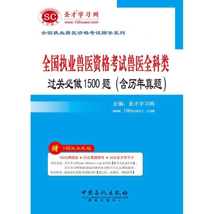 执业兽医资格考试是对兽医从业人员的一种准入考试。2009年执业兽医资格考试在广西、吉林、河南、重庆、宁夏等5省(自治区、直辖市)开展试点工作,自2010年起执业兽医资格考试开始全国性统一考试。 执业兽医资格考试分兽医综合知识考试和临床技能考试两部分(2011年全国执业兽医资格考试只考查兽医综合知识部分)。兽医综合知识考试包括4科,即基础科目、预防科目、临床科目、综合应用科目。考试由农业部组织,全国统一大纲、统一命题、统一考试,原则上每年举行一次,具体考试时间由全国执业兽医资格考试委员会确定,并提前3个月向社会公布。 为了帮助考生顺利通过全国执业兽医资格考试,我们根据最新《全国执业兽医资格考试大纲》和指定参考教材编写了全国执业兽医资格考试辅导系列: 1.系列之一:《全国执业兽医资格考试兽医全科类过关必做1500题(含历年真题)》 2.系列之二:《全国执业兽医资格考试兽医全科类历年真题与模拟试题详解》 3.系列之三:《全国执业兽医资格考试(水生动物类)过关必做1200题》 本书是全国执业兽医资格考试的过关必做习题集。本书根据《2011年全国执业兽医资格考试大纲》的要求及相关法律法规,精心编写了约1500道习题,其中包括了2009~2010年执业兽医资格考试的部分真题。所选习题基本涵盖了考试大纲规定需要掌握的知识内容,侧重于选编常考难点习题。 2010年版《全国执业兽医资格考试过关必做3000题(含历年真题)》涵盖了当年考题全部考点,直接命中真题100余道,2011年将3000题精简为1500题,并将每道题都进行了详细解析,考生需配合《全国执业兽医资格考试兽医全科类历年真题与模拟试题详解》使用,练习、冲刺模拟结合,以提高复习效率,顺利通过考试。 需要特别说明的是:如果相关法律法规、考试大纲以及其他考试资料发生变化,我们会及时根据最新考试大纲对本书进行修订和说明,读者可以登录圣才学习网(www.100xuexi.com)查看并下载相关修订部分。本书参考了众多的配套资料和相关参考书,书中错误、遗漏不可避免,敬请指正和提出建议。 圣才学习网(www.100xuexi.com)是一家为全国各类考试和专业课学习提供名师网授班、面授班、在线考试等全方位教育服务的综合性学习型门户网站,拥有近100种考试(含418个考试科目)、194种经典教材(含英语、经济、证券、金融等共16大类)。对于各类考试一般开设11种辅导班型,经典教材开设5种辅导班型(具体班型参见网站),合计近万小时的面授班、网授班光盘培训课程,可为加盟商提供专用于录像播放班的免费光盘。 圣才考研网(www.100xuexi.com)是圣才学习网旗下的考研考博专业网站,提供全国所有院校各个专业的考研考博辅导班(保过班、面授班、网授班等)、经典教材名师讲堂、考研题库系统(在线考试)、全套资料(历年真题及答案、笔记讲义等)、考研教辅图书等。 圣才学习网(www.100xuexi.com)│国家职业资格提供医药卫生类(包括兽医师)考试辅导方案(辅导班、题库)。(详细介绍参见本书书前彩页)。购书享受大礼包增值服务【100元网授班+20元真题模考+20元圣才学习卡】 咨询热线:01062515021,4006123191(免长途费) 兽医考试:www.100xuexi.com(圣才学习网) 考研辅导:www.100xuexi.com(圣才考研网) 圣才学习网编辑部 详情登录网站:www.100zyzg.com(国家职业资格考试网)(进入“兽医师”专栏) 购书购盘热线:010-62573996QQ:742045041(海淀图书城书店)