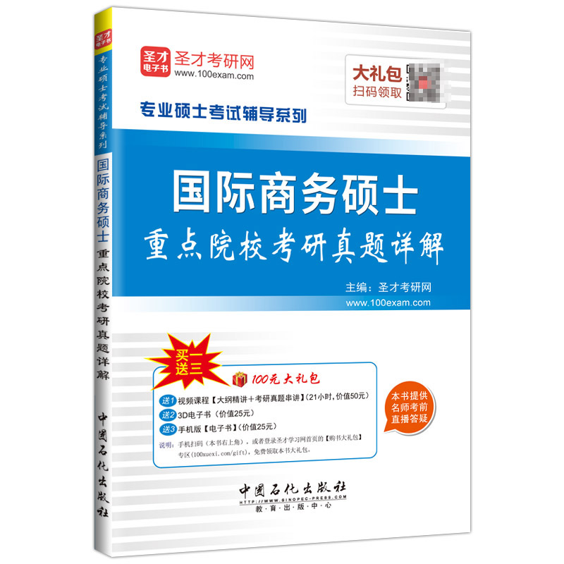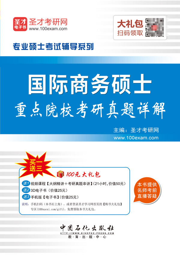 圣才考研网(www.100xuexi.com)提供全国各高校国际商务硕士考研辅导班【一对一辅导(面授/网授)、网授精讲班等】、3D电子书、3D题库(免费下载+送手机版)、全套资料(历年真题及答案、笔记讲义等)。购书享受大礼包增值服务【50元视频课程+25元3D电子书+25元手机版电子书】。本书提供名师考前直播答疑,手机电脑均可观看,直播答疑在考前推出(具体时间见网站公告)。手机扫码(本书封面的二维码),或者登录圣才学习网首页的【购书大礼包】专区(www.100xuexi.com/gift),免费领取本书大礼包。