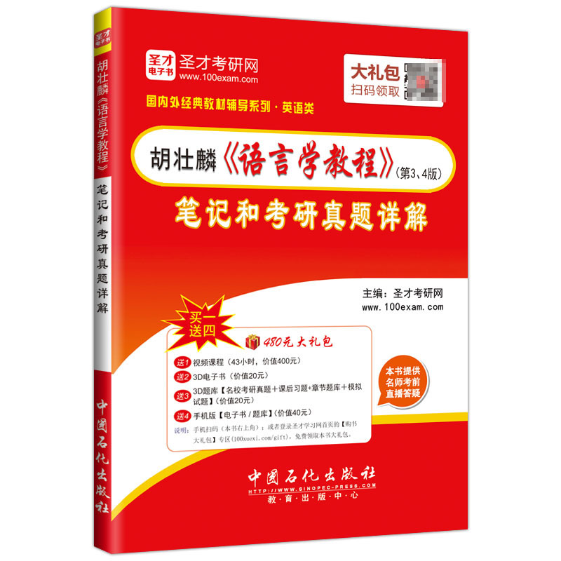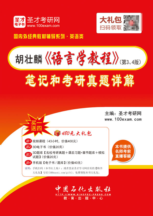 圣才考研网(www.100xuexi.com)提供胡壮麟《语言学教程》网授精讲班【教材精讲+考研真题串讲】、3D电子书、3D题库。购书享受大礼包增值服务【400元视频课程+20元3D电子书+20元3D题库+40元手机版电子书/题库】。本书提供名师考前直播答疑,手机电脑均可观看,直播答疑在考前推出(具体时间见网站公告)。手机扫码(本书封面的二维码),或者登录圣才学习网首页的【购书大礼包】专区(100xuexi.com/gift),免费领取本书大礼包。