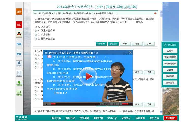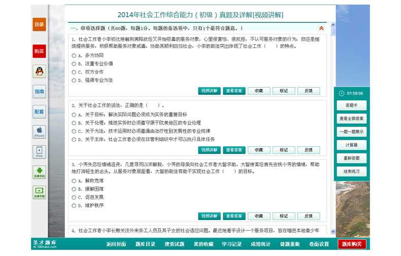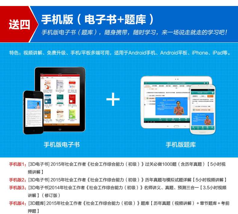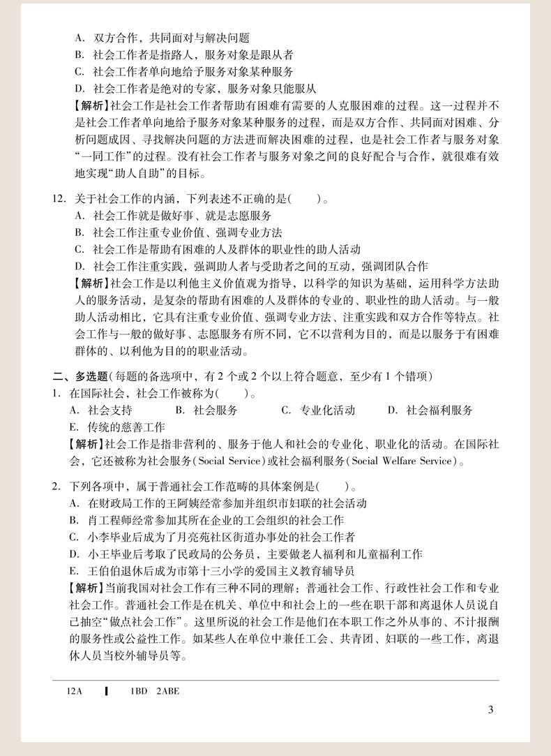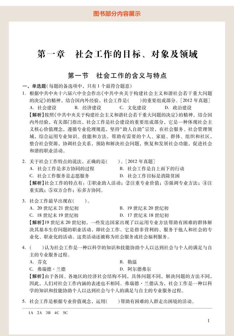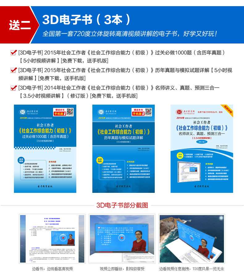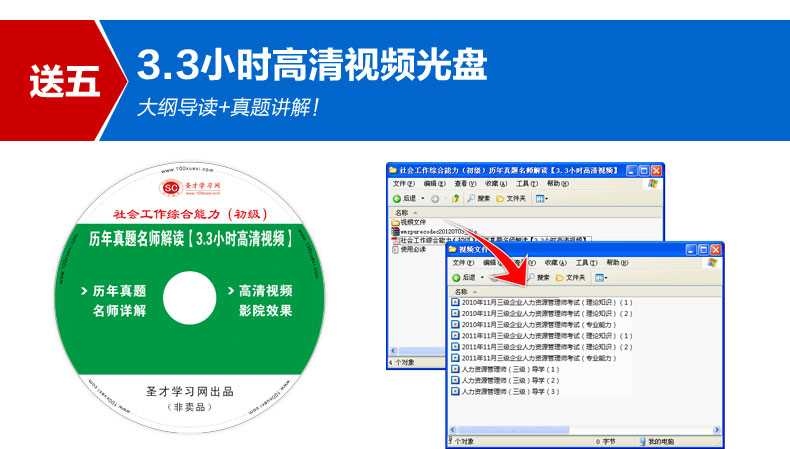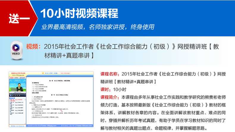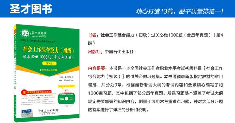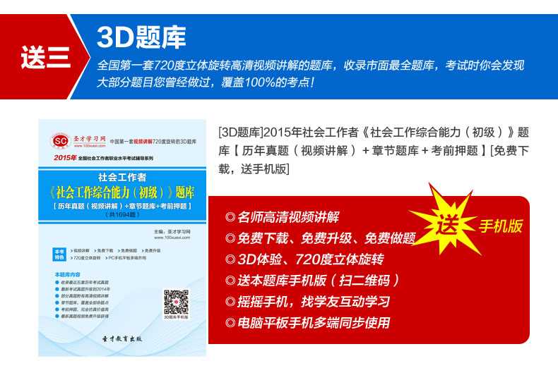 随书赠送高清视频光盘【历年真题名师解读(3.3小时高清视频)】,光盘内容包括两套真题的讲解视频:①2012年社会工作综合能力(初级)真题及详解;②2010社会工作综合能力(初级)真题及详解。每题(包括每个选项)从难易程度、考察知识点等方面进行全面、细致的解析。同时,享受大礼包增值服务【100元网授班+20元真题模考+20元圣才学习卡】。