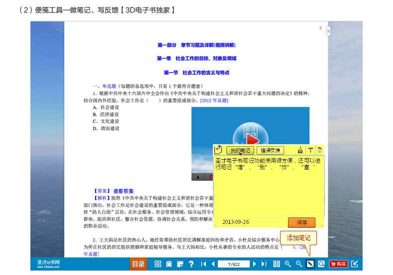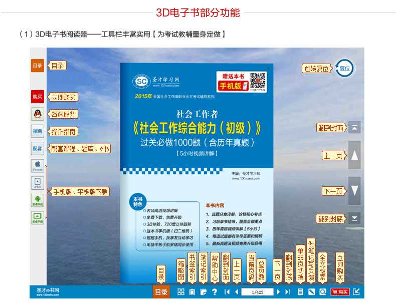 圣才学习网(www.100xuexi.com)拥有全国各种考试(学历、等级、职称资格等)和专业课(经管类、外语类、理工类等)辅导共计5万种3D电子书(题库)。圣才电子书(题库)采用“学习+社交+媒体”模式,可植入高清视频、动画漫画,自带互动聊天、直播功能,可720度立体旋转。