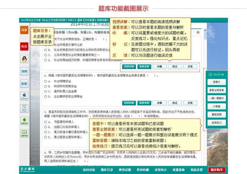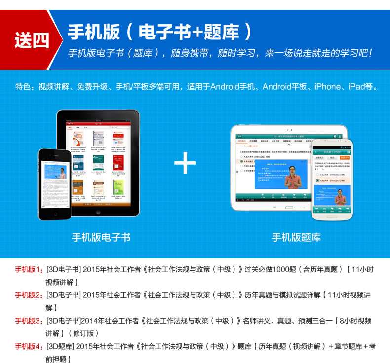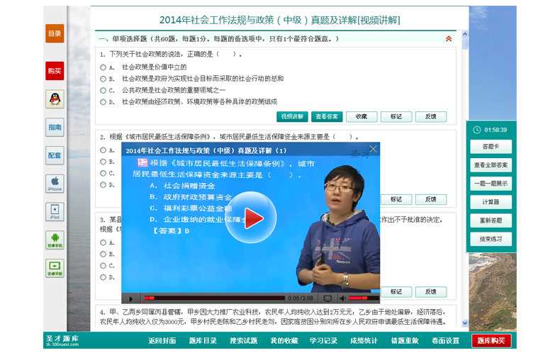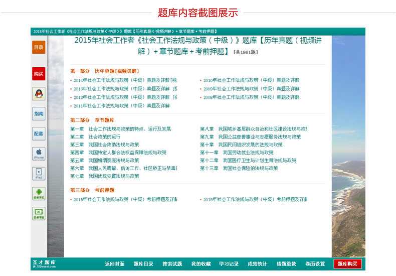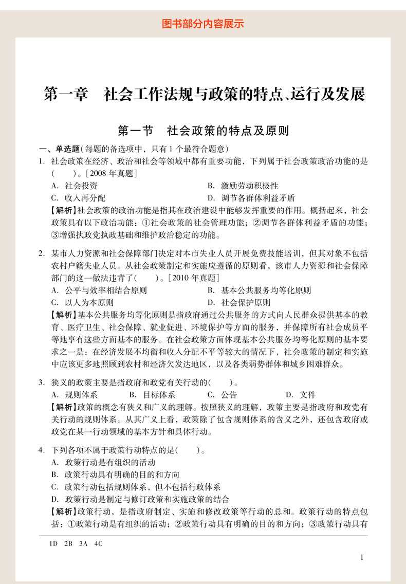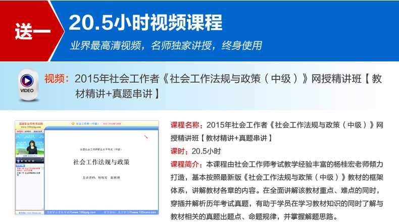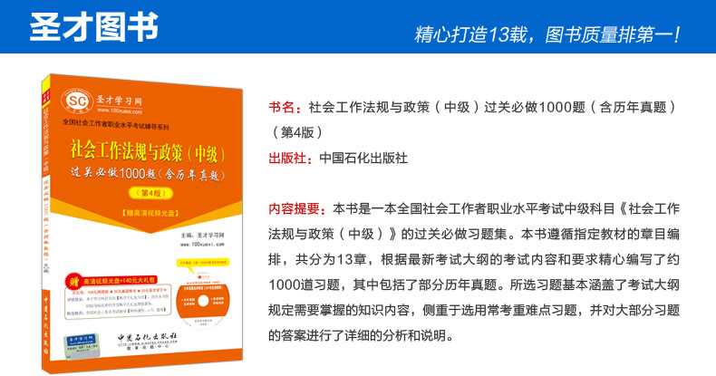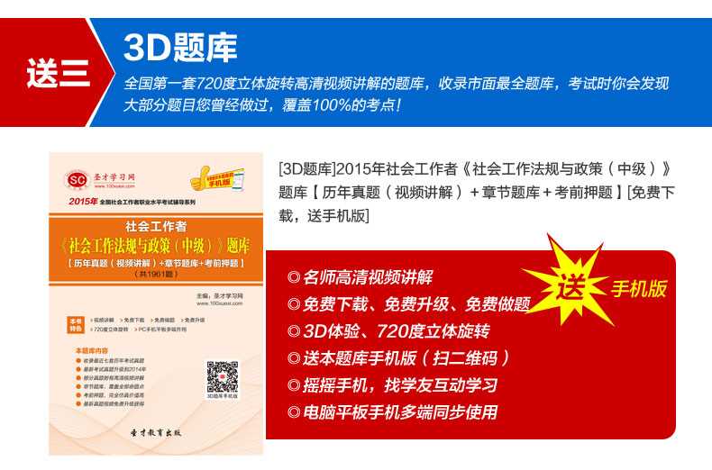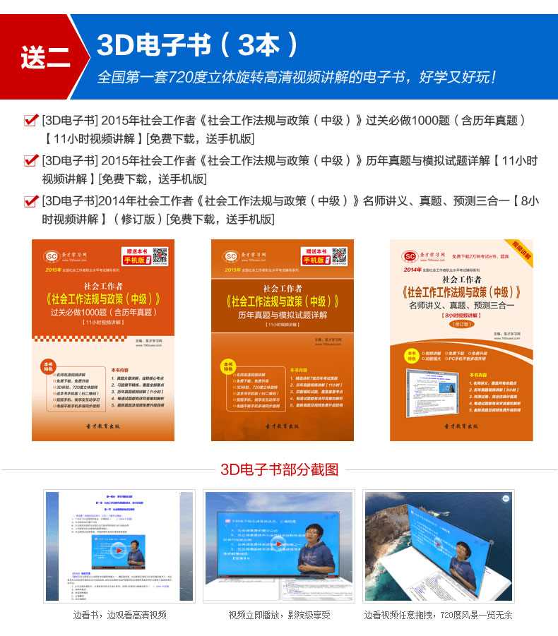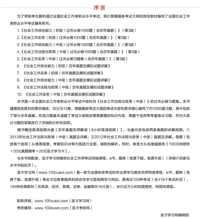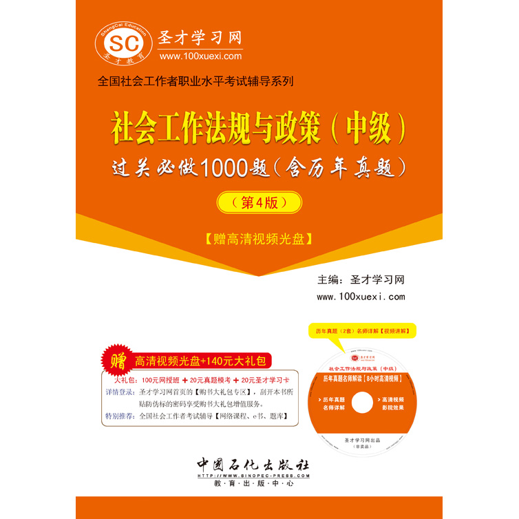随书赠送高清视频光盘【历年真题名师解读(8小时高清视频)】,光盘内容包括两套真题的讲解视频:①2013年社会工作法规与政策(中级)真题及详解;②2012年社会工作法规与政策(中级)真题及详解。每题(包括每个选项)从难易程度、考察知识点等方面进行全面、细致的解析。同时,享受大礼包增值服务【100元网授班+20元真题模考+20元圣才学习卡】。