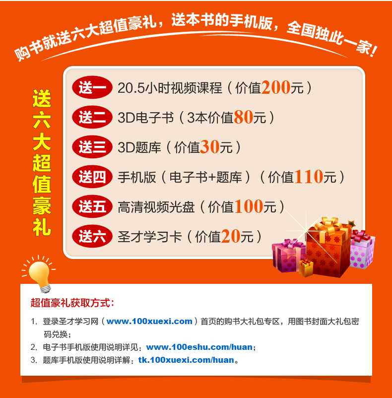 购买本书享受大礼包增值服务,登录圣才学习网(www.100xuexi.com),点击圣才学习网首页的大礼包【购书大礼包】,刮开所购图书封面防伪标的密码,即可享受大礼包增值服务。扫一扫本书封面的二维码,可免费下载本书手机版;摇一摇本书手机版,可找到所有学习本书的学友,交友学习两不误。本书提供名师考前直播答疑,手机电脑均可观看,直播答疑在考前推出(具体时间见网站公告)。