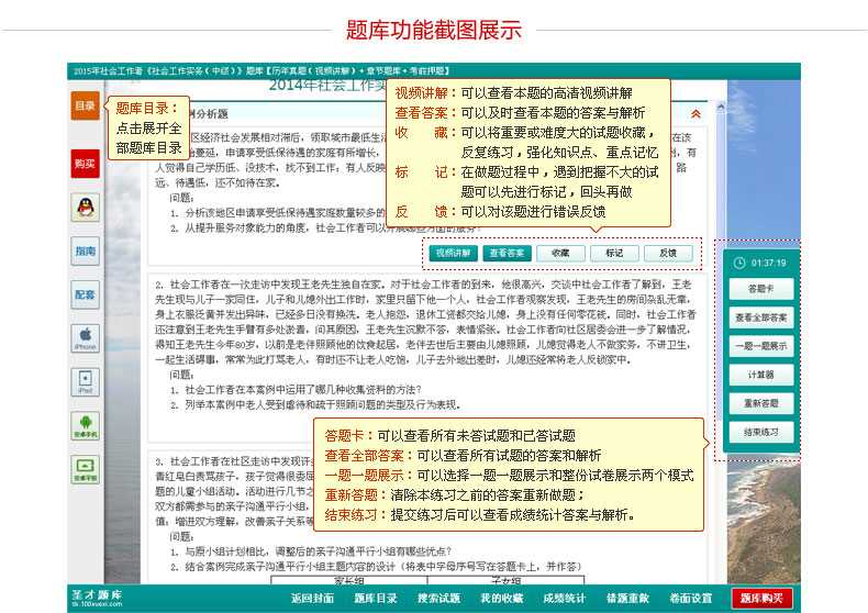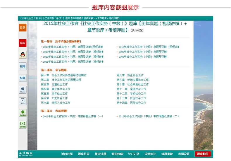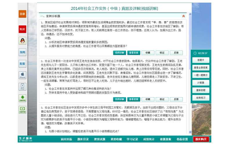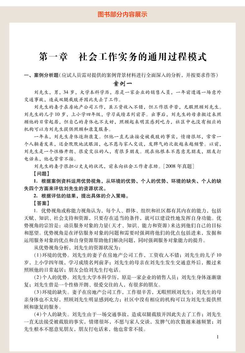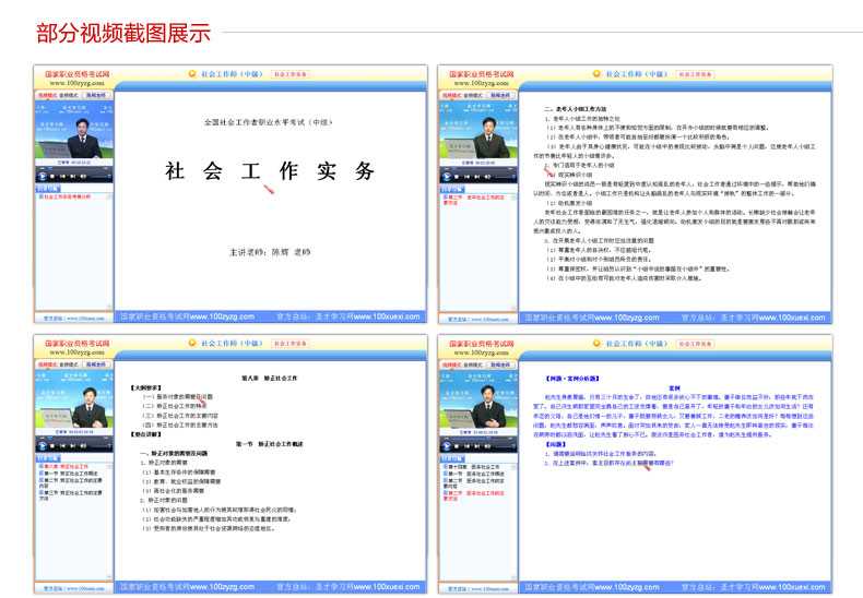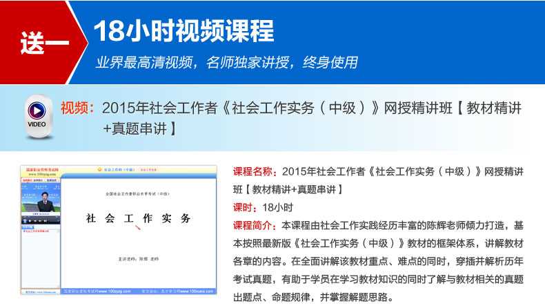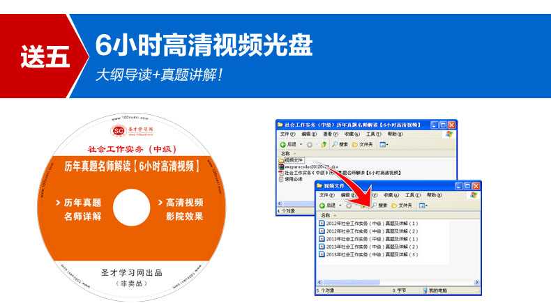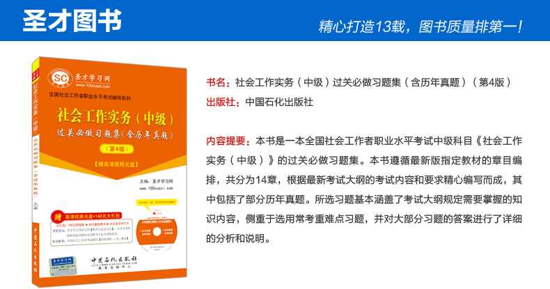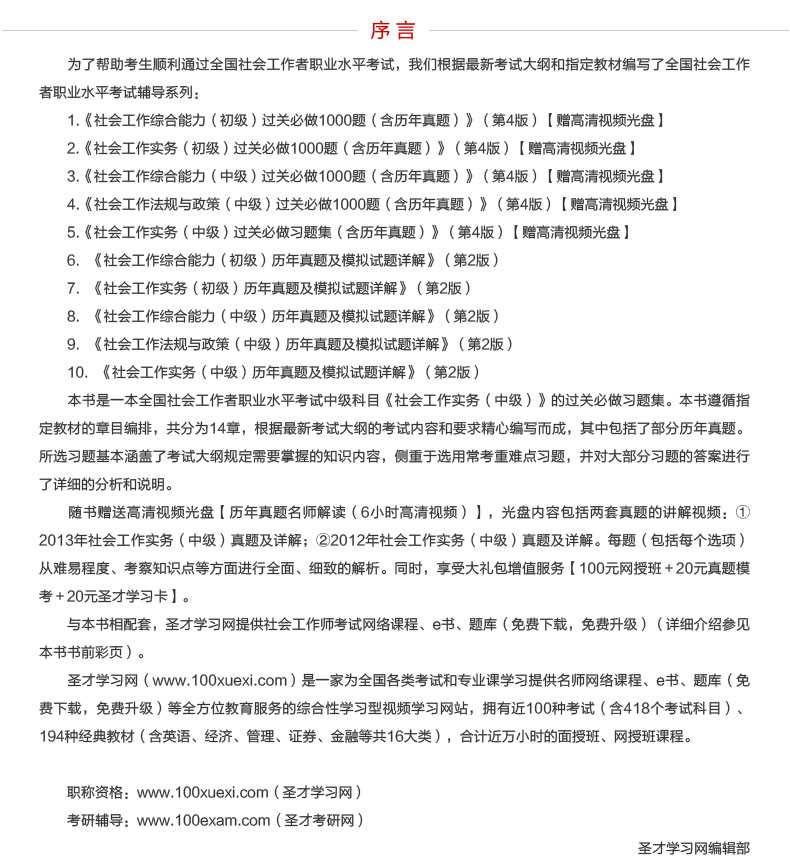 随书赠送高清视频光盘【历年真题名师解读(6小时高清视频)】,光盘内容包括两套真题的讲解视频:①2013年社会工作实务(中级)真题及详解;②2012年社会工作实务(中级)真题及详解。每题(包括每个选项)从难易程度、考察知识点等方面进行全面、细致的解析。同时,享受大礼包增值服务【100元网授班+20元真题模考+20元圣才学习卡】。