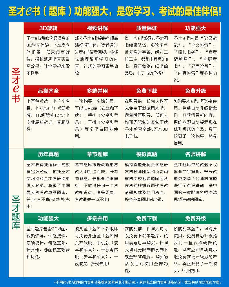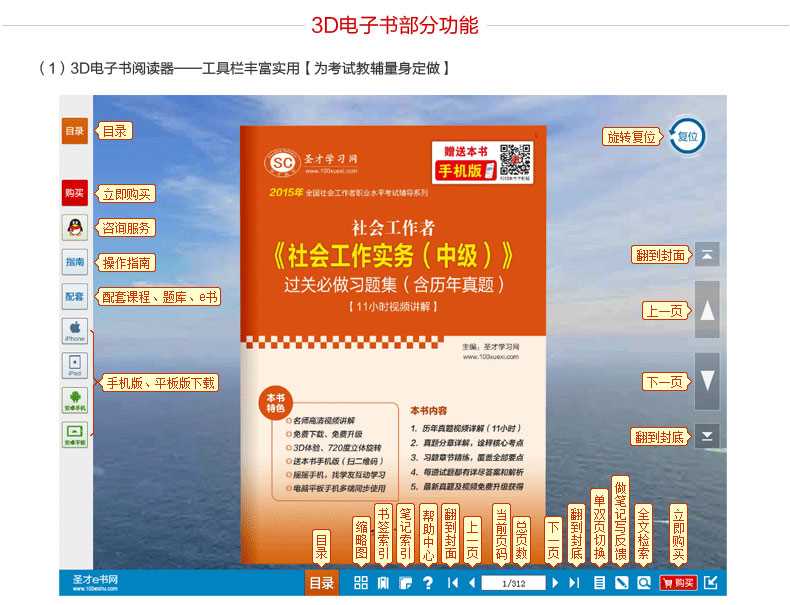 圣才学习网(www.100xuexi.com)拥有全国各种考试(学历、等级、职称资格等)和专业课(经管类、外语类、理工类等)辅导共计5万种3D电子书(题库)。圣才电子书(题库)采用“学习+社交+媒体”模式,可植入高清视频、动画漫画,自带互动聊天、直播功能,可720度立体旋转。