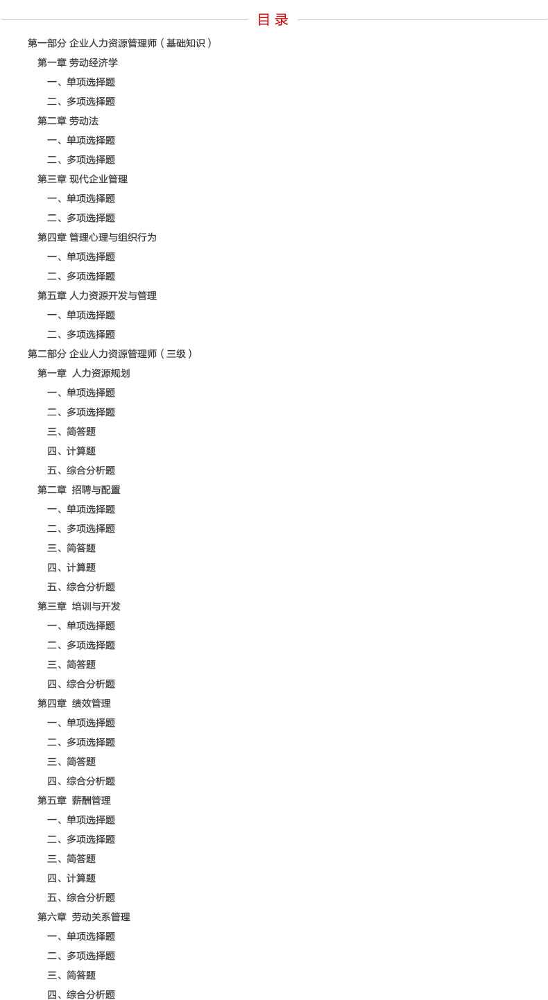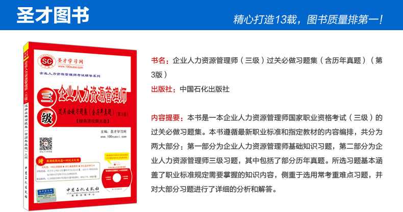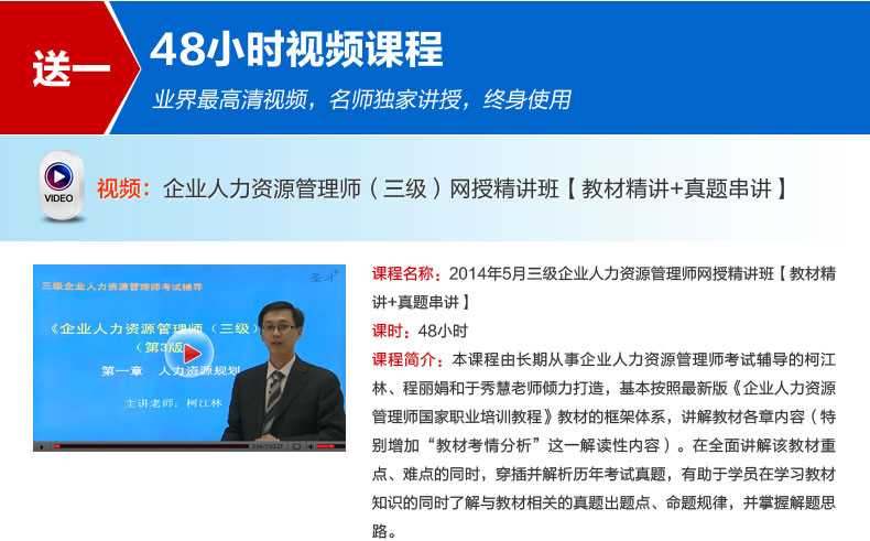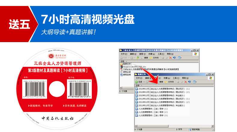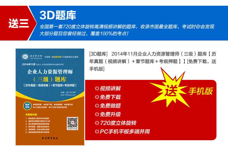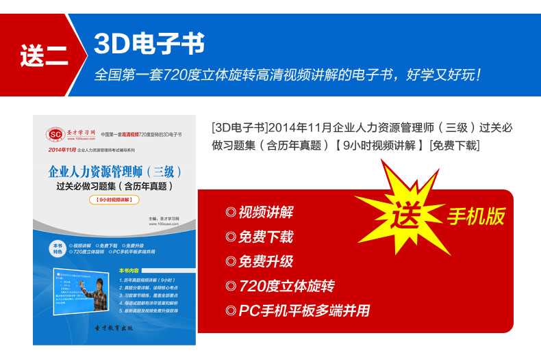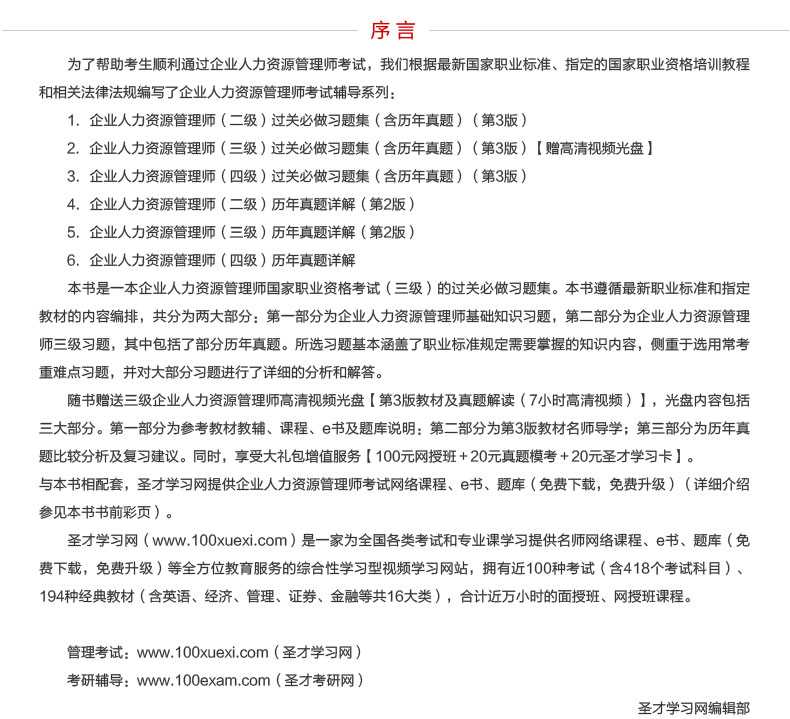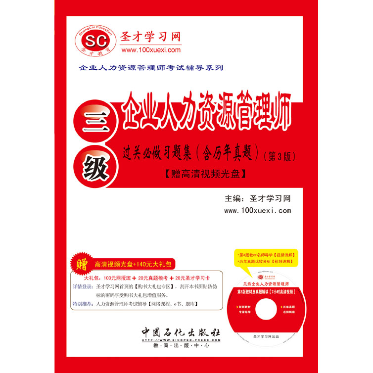随书赠送三级企业人力资源管理师高清视频光盘【第3版教材及真题解读(7小时高清视频)】,光盘内容包括三大部分。第一部分为参考教材教辅、课程、e书及题库说明:第二部分为第3版教材名师导学;第三部分为历年真题比较分析及复习建议。同时,享受大礼包增值服务【100元网授班+20元真题模考+20元圣才学习卡】。