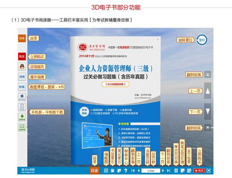 圣才学习网(www.100xuexi.com)拥有全国各种考试(学历、等级、职称资格等)和专业课(经管类、外语类、理工类等)辅导共计5万种3D电子书(题库)。圣才电子书(题库)采用“学习+社交+媒体”模式,可植入高清视频、动画漫画,自带互动聊天、直播功能,可720度立体旋转。