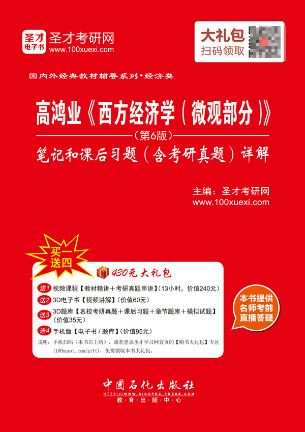 圣才考研网(www.100xuexi.com)提供高鸿业《西方经济学(微观部分)》网授精讲班【教材精讲+考研真题串讲】、3D电子书、3D题库。购书享受大礼包增值服务【240元视频课程+60元3D电子书+35元3D题库+95元手机版电子书/题库】。本书提供名师考前直播答疑,手机电脑均可观看,直播答疑在考前推出(具体时间见网站公告)。手机扫码(本书封面的二维码),或者登录圣才学习网首页的【购书大礼包】专区(www.100xuexi.com/gift),免费领取本书大礼包。