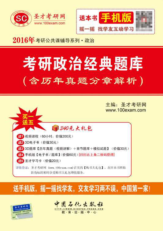 圣才考研网(www.100xuexi.com)提供考研政治辅导方案【网络课程、3D电子书、3D题库等】(详细介绍参见本书书前彩页)。购书享受大礼包增值服务【200元视频课程+60元3D电子书(题库)+60元手机版电子书(题库)+20元圣才学习卡】。扫一扫本书封面的二维码,可免费下载本书手机版;摇一摇本书手机版,可找到所有学习本书的学友,交友学习两不误。