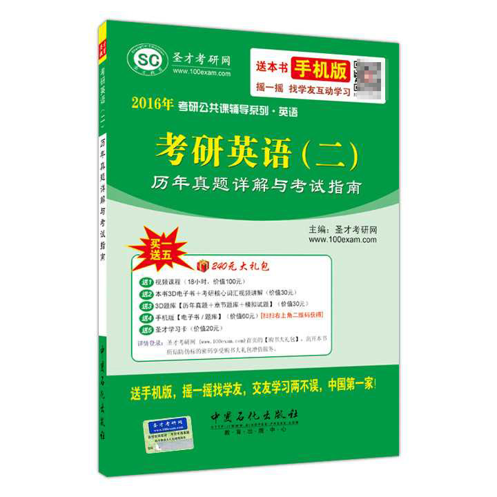 圣才考研网(www.100xuexi.com)提供考研英语辅导方案【网络课程、3D电子书、3D题库等】(详细介绍参见本书书前彩页)。购书享受大礼包增值服务【360元视频课程+60元3D电子书(题库)+60元手机版电子书(题库)+20元圣才学习卡】。扫一扫本书封面的二维码,可免费下载本书手机版;摇一摇本书手机版,可找所有学习本书的学友,交友学习两不误。