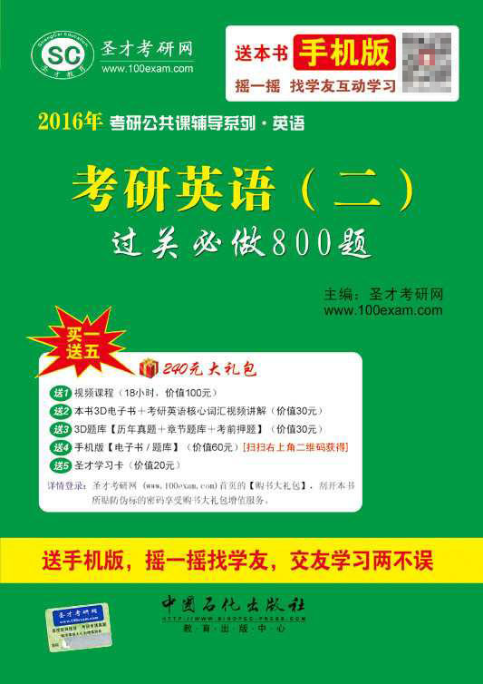 圣才考研网(www.100xuexi.com)提供考研英语辅导方案【网络课程、3D电子书、3D题库等】(详细介绍参见本书书前彩页)。购书享受大礼包增值服务【360元视频课程+60元3D电子书(题库)+60元手机版电子书(题库)+20元圣才学习卡】。扫一扫本书封面的二维码,可免费下载本书手机版;摇一摇本书手机版,可找所有学习本书的学友,交友学习两不误。