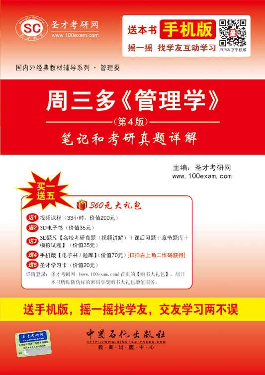 圣才考研网(www.100xuexi.com)提供周三多《管理学》网授精讲班【教材精讲+考研真题串讲】、3D电子书、3D题库(详细介绍参见本书书前彩页)。随书赠送大礼包增值服务【200元网授班+70元3D电子书(题库)+70元手机版电子书(题库)+20元圣才学习卡】。扫一扫本书封面的二维码,可免费下载本书手机版;摇一摇本书手机版,可找到所有学习本书的学友,交友学习两不误。