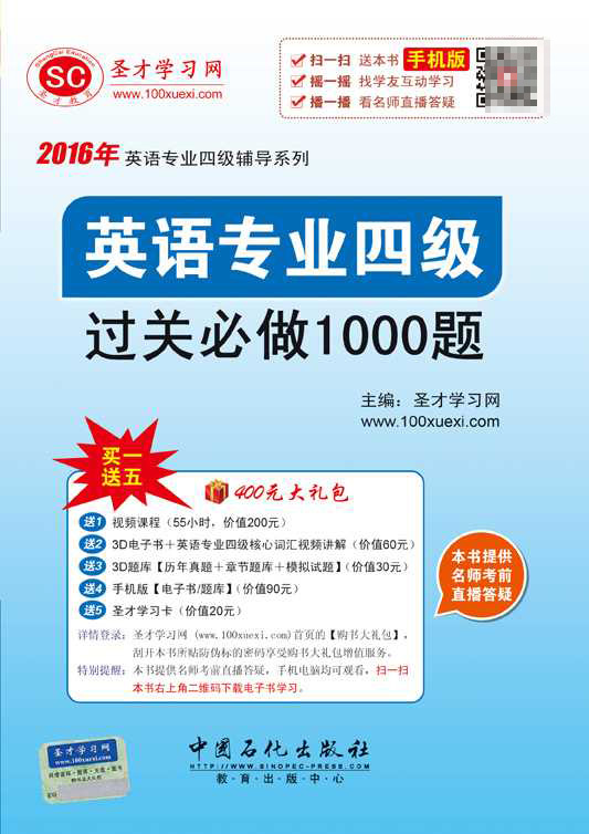 圣才学习网(www.100xuexi.com)提供英语专业四级考试辅导方案【网络课程、3D电子书、3D题库等】(详细介绍参见本书书前彩页)。购书享受大礼包增值服务【200元视频课程+90元3D电子书(题库)+90元手机版电子书(题库)+20元圣才学习卡】。扫一扫本书封面的二维码,可免费下载本书手机版;摇一摇本书手机版,可找所有学习本书的学友,交友学习两不误;本书提供名师考前直播答疑,手机电脑均可观看,直播答疑在考试前一个月推出。