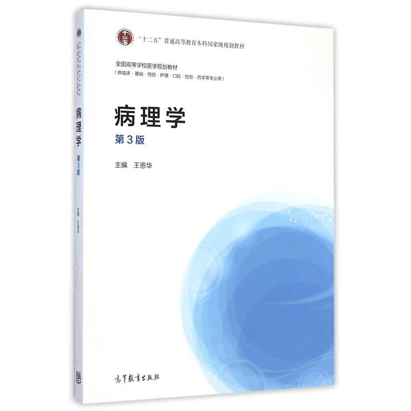 《病理学(供临床基础预防护理口腔检验药学等专业用第3版全国高等学校医学规划教材)》是“十二五”普通高等教育本科国家级规划教材,由中国医科大学王恩华教授担任主编。《病理学》含有400余幅彩图,并附有中英文图题、图注;本书在第2版的基础上,适度增加了部分分子病理内容及检测某些基因改变的临床意义;根据本学科的最新进展和临床疾病谱的变化,引入了自嗜、转分化、上皮间质转化等概念,用弥漫性神经内分泌细胞肿瘤取代以往的APUD瘤,简介了特发性间质性肺炎和类型、SARS和禽流感等新病种;书中涉及的所有肿瘤的名称和分类均以最新WH0命名和分类为准。书中设有易混概念、CPC的讨论复习思考题。另设自学内容“诊断病理学概要”和“病理学常用新技术的原理及应用”两章。