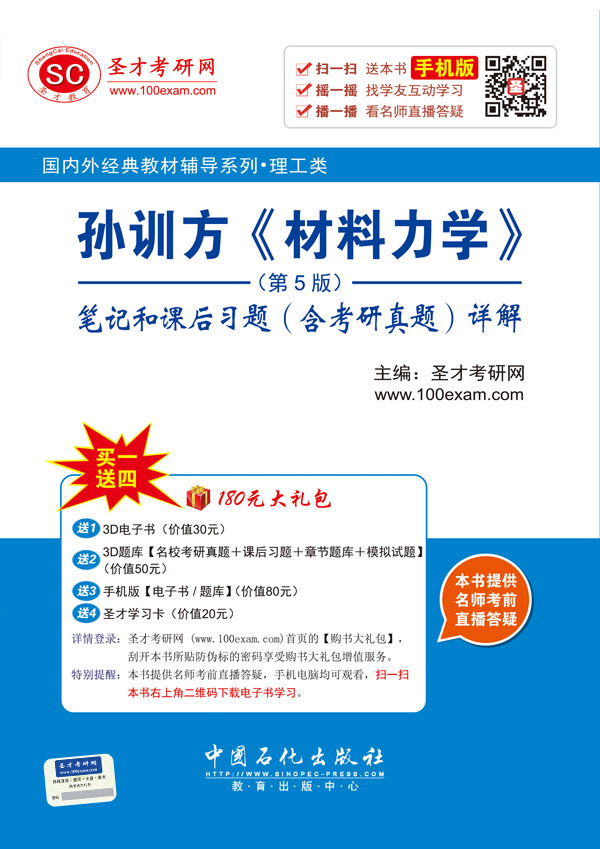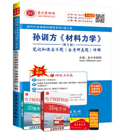 圣才考研网(www.100xuexi.com)提供孙训方《材料力学》网授精讲班【教材精讲+考研真题串讲】、3D电子书、3D题库(详细介绍参见本书书前彩页)。随书赠送大礼包增值服务【30元3D电子书+50元3D题库+80元手机版电子书/题库+20元圣才学习卡】。扫一扫本书封面的二维码,可免费下载本书手机版;摇一摇本书手机版,可找到所有学习本书的学友,交友学习两不误;本书提供名师考前直播答疑,手机电脑均可观看,直播答疑在考前推出(具体时间见网站公告)。