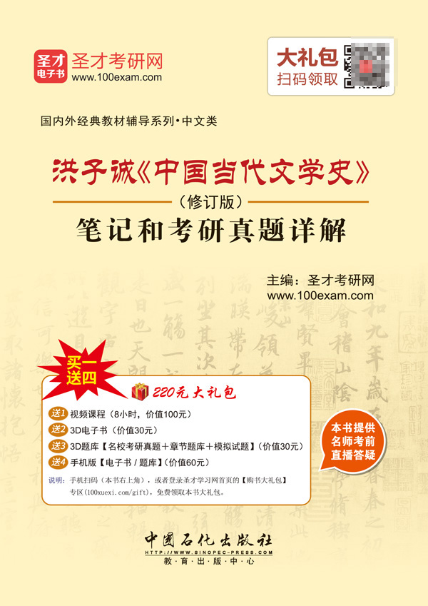 圣才考研网(www.100xuexi.com)提供洪子诚《中国当代文学史》网授精讲班【教材精讲+考研真题串讲】、3D电子书、3D题库。购书享受大礼包增值服务【100元视频课程+30元3D电子书+30元3D题库+60元手机版电子书/题库。本书提供名师考前直播答疑,手机电脑均可观看,直播答疑在考前推出(具体时间见网站公告)。手机扫码(本书封面的二维码),或者登录圣才学习网首页的【购书大礼包】专区(www.100xuexi.com/gift),免费领取本书大礼包。