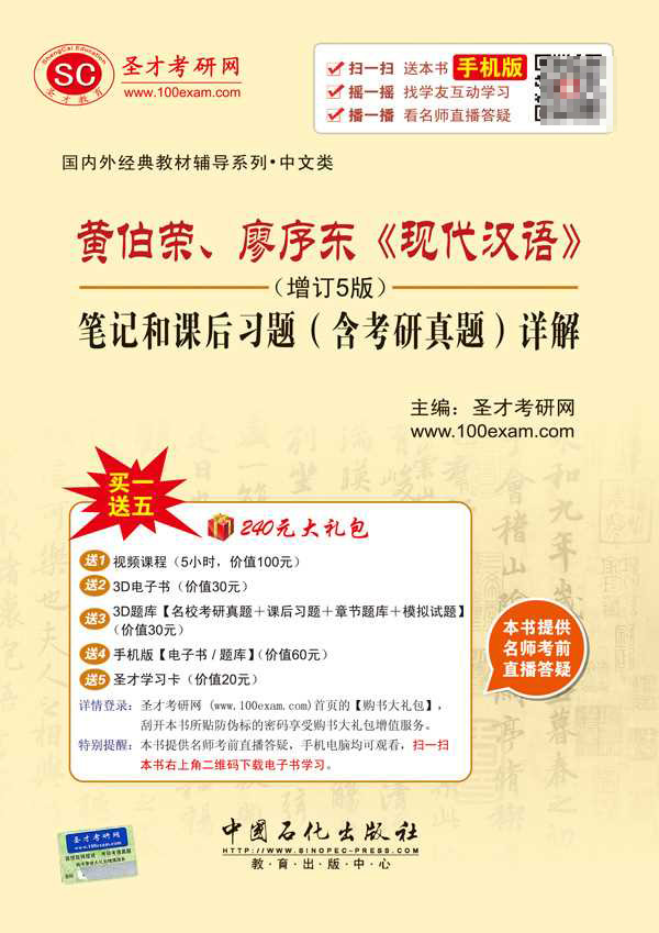 圣才考研网(www.100xuexi.com)提供黄伯荣、廖序东《现代汉语》网授精讲班【教材精讲+考研真题串讲】、3D电子书、3D题库(详细介绍参见本书书前彩页)。购书享受大礼包增值服务【100元视频课程+60元3D电子书(题库)+60元手机版电子书(题库)+20元圣才学习卡】。扫一扫本书封面的二维码,可免费下载本书手机版;摇一摇本书手机版,可找所有学习本书的学友,交友学习两不误;本书提供名师考前直播答疑,手机电脑均可观看,直播答疑在考前推出(具体时间见网站公告)。