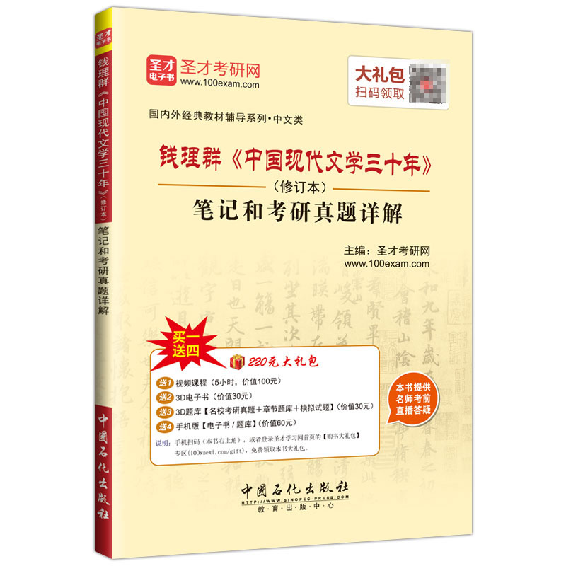 圣才考研网(www.100xuexi.com)提供钱理群《中国现代文学三十年》网授精讲班【教材精讲+考研真题串讲】、3D电子书、3D题库。购书享受大礼包增值服务【100元视频课程+30元3D电子书+30元3D题库+60元手机版电子书/题库】。本书提供名师考前直播答疑,手机电脑均可观看,直播答疑在考前推出(具体时间见网站公告)。手机扫码(本书封面的二维码),或者登录圣才学习网首页的【购书大礼包】专区(www.100xuexi.com/gift),免费领取本书大礼包。