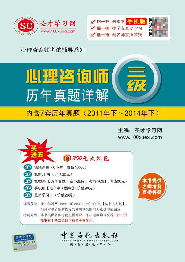 圣才学习网(www.100xuexi.com)提供心理咨询师国家职业资格等各种心理类考试辅导方案【网络课程、3D电子书、3D题库等】(详细介绍参见本书书前内页)。购书享受大礼包增值服务【100元网授班+90元3D电子书(题库)+90元手机版电子书(题库)+20元圣才学习卡】。扫一扫本书封面的二维码,可免费下载本书手机版;摇一摇本书手机版,可找所有学习本书的学友,交友学习两不误;本书提供名师考前直播答疑,手机电脑均可观看,直播答疑在考前推出(具体时间见网站公告)。