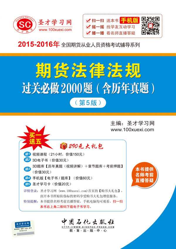 圣才学习网(www.100xuexi.com)提供全国期货从业人员资格考试等各种考试辅导方案【网络课程、3D电子书、3D题库等】(详细介绍参见本书书前彩页)。购书享受大礼包增值服务【150元网授班+60元3D电子书(题库)+60元手机版电子书(题库)+20元圣才学习卡】。扫一扫本书封面的二维码,可免费下载本书手机版;摇一摇本书手机版,可找到所有学习本书的学友,交友学习两不误;本书提供名师考前直播答疑,手机电脑均可观看,直播答疑在考前推出(具体时间见网站公告)。