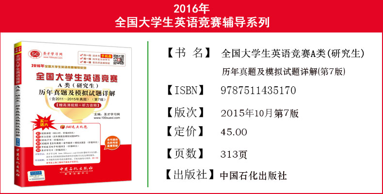 本书是专门为提高考生参加全国大学生英语竞赛A类(研究生)考试水平而编写的复习资料。其内容包括9套真题(2011~2015年)和3套模拟试题, 每套试题均给出参考答案及详解。历年真题为考生提供了最好的复习依据,便于读者了解考试的命题特点和出题规律,答案详解则为考生分析了解题技巧,指明了解 题思路。模拟试题根据最新一年(2015年)的真题及样题,在参考众多相关考试用书、国内外权威杂志以及优秀论文等大量素材的基础上精心设计而成,具有很 强的针对性和实用性。