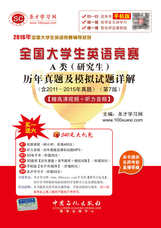 购买本书享受大礼包增值服务,登录圣才学习网(www.100xuexi.com),点击圣才学习网首页的大礼包【购书大礼包】,刮开所购图书封面防伪标的密码,即可享受大礼包增值服务。扫一扫本书封面的二维码,可免费下载本书手机版;摇一摇本书手机版,可找到所有学习本书的学友,交友学习两不误。本书提供名师考前直播答疑,手机电脑均可观看,直播答疑在考前推出(具体时间见网站公告)。