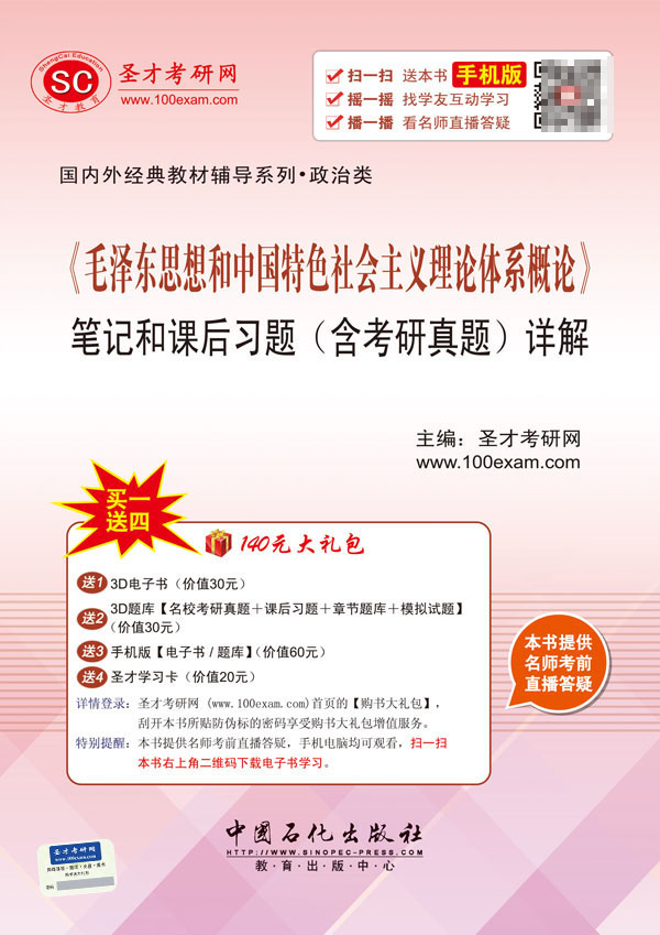 圣才考研网(www.100xuexi.com)提供高教版《毛泽东思想和中国特色社会主义理论体系概论》网授精讲班【教材精讲+考研真题串讲】、3D电子书、3D题库(详细介绍参见本书书前彩页)。随书赠送大礼包增值服务【30元3D电子书+30元3D题库+60元手机版电子书/题库+20元圣才学习卡】。扫一扫本书封面的二维码,可免费下载本书手机版;摇一摇本书手机版,可找到所有学习本书的学友,交友学习两不误;本书提供名师考前直播答疑,手机电脑均可观看,直播答疑在考前推出(具体时间见网站公告)。