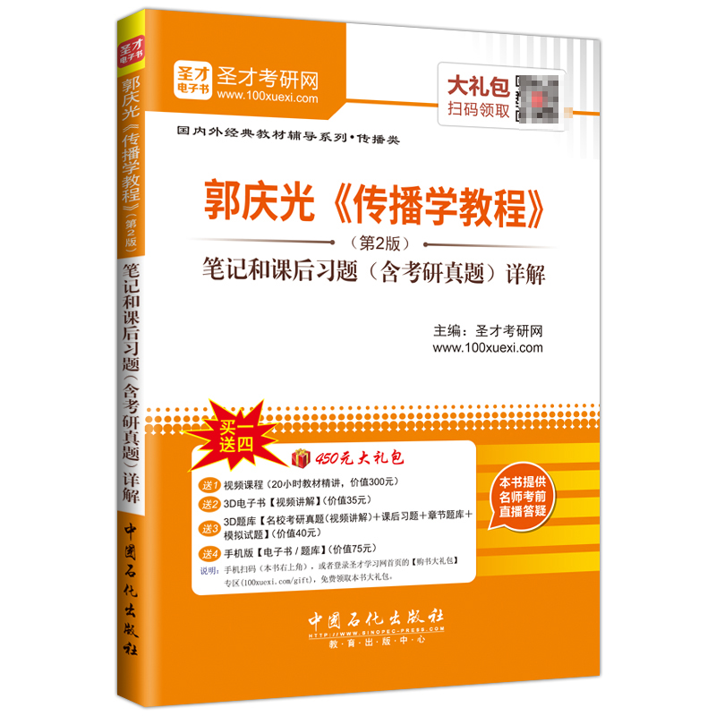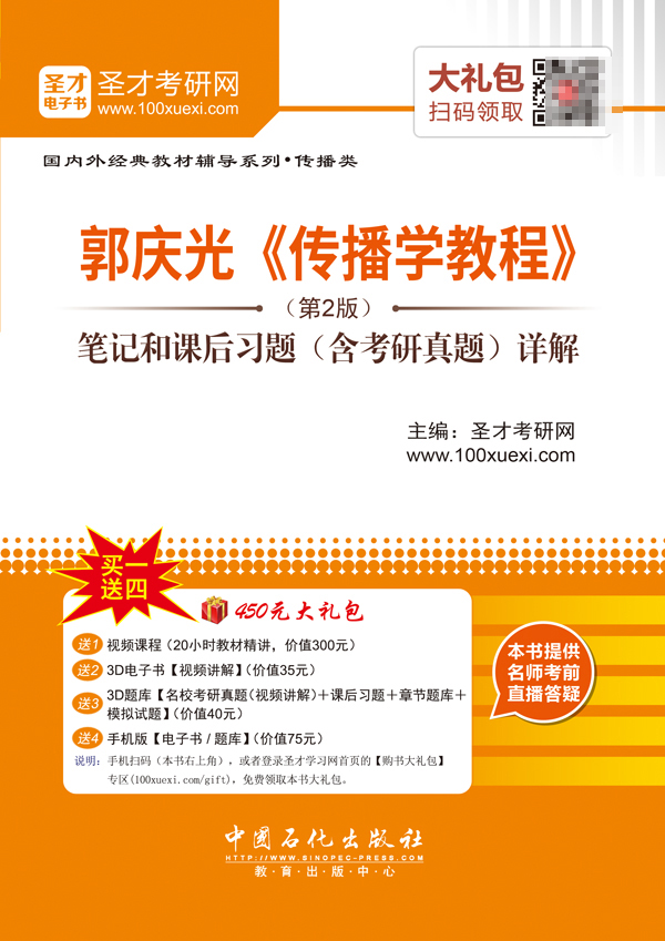 圣才考研网(www.100xuexi.com)提供郭庆光《传播学教程》网授精讲班【教材精讲+考研真题串讲】、3D电子书、3D题库。购书享受大礼包增值服务【300元视频课程+35元3D电子书+40元3D题库+75元手机版电子书/题库】。本书提供名师考前直播答疑,手机电脑均可观看,直播答疑在考前推出(具体时间见网站公告)。手机扫码(本书封面的二维码),或者登录圣才学习网首页的【购书大礼包】专区(www.100xuexi.com/gift),免费领取本书大礼包。