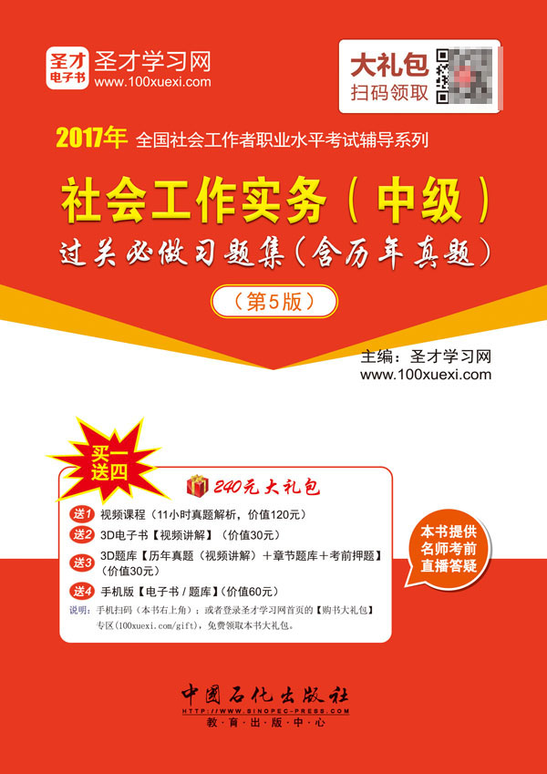 圣才学习网(www.100xuexi.com)提供社会工作者等各种职业资格类考试辅导方案【视频课程、3D电子书、3D题库等】。购书享受大礼包增值服务【120元视频课程+30元3D电子书+30元3D题库+60元手机版电子书/题库】。本书提供名师考前直播答疑,手机电脑均可观看,直播答疑在考前推出(具体时间见网站公告)。手机扫码(本书封面的二维码),或者登录圣才学习网首页的【购书大礼包】专区(www.100xuexi.com/gift),免费领取本书大礼包。