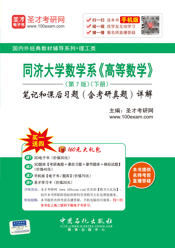 圣才考研网(www.100xuexi.com)提供同济大学数学系《高等数学》网授精讲班【教材精讲+考研真题串讲】、3D电子书、3D题库(详细介绍参见本书书前彩页)。随书赠送大礼包增值服务【30元3D电子书+40元3D题库+70元手机版电子书/题库+20元圣才学习卡】。扫一扫本书封面的二维码,可免费下载本书手机版;摇一摇本书手机版,可找到所有学习本书的学友,交友学习两不误;本书提供名师考前直播答疑,手机电脑均可观看,直播答疑在考前推出(具体时间见网站公告)。