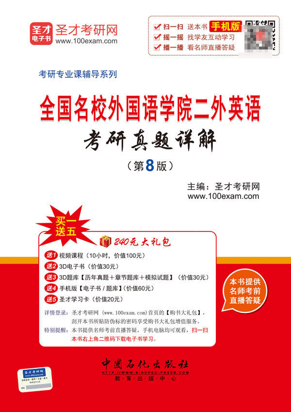 圣才考研网(www.100xuexi.com)提供全国所有高校各个专业的考研考博辅导方案【网络课程、3D电子书、3D题库等】(详细介绍参见本书书前彩页)。购书享受大礼包增值服务【100元视频课程+30元3D电子书+30元3D题库+60元手机版电子书/题库+20元圣才学习卡】。扫一扫本书封面的二维码,可免费下载本书手机版;摇一摇本书手机版,可找所有学习本书的学友,交友学习两不误;本书提供名师考前直播答疑,手机电脑均可观看,直播答疑在考前推出(具体时间见网站公告)。