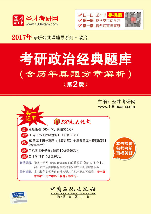 圣才考研网(www.100xuexi.com)提供考研政治辅导方案【网络课程、3D电子书、3D题库等】(详细介绍参见本书书前彩页)。购书享受大礼包增值服务【360元视频课程+30元3D电子书+30元3D题库+60元手机版电子书/题库+20元圣才学习卡】。扫一扫本书封面的二维码,可免费下载本书手机版;摇一摇本书手机版,可找到所有学习本书的学友,交友学习两不误;本书提供名师考前直播答疑,手机电脑均可观看,直播答疑在考前推出(具体时间见网站公告)。