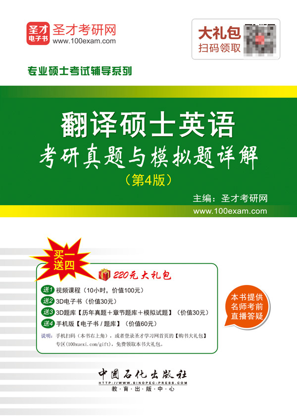 圣才考研网(www.100xuexi.com)提供全国所有高校各个专业(如翻译硕士)的考研考博辅导方案【视频课程、3D电子书、3D题库等】。购书享受大礼包增值服务【100元视频课程+30元3D电子书+30元3D题库+60元手机版电子书/题库】。本书提供名师考前直播答疑,手机电脑均可观看,直播答疑在考前推出(具体时间见网站公告)。手机扫码(本书封面的二维码),或者登录圣才学习网首页的【购书大礼包】专区(100xuexi.com/gift),免费领取本书大礼包。