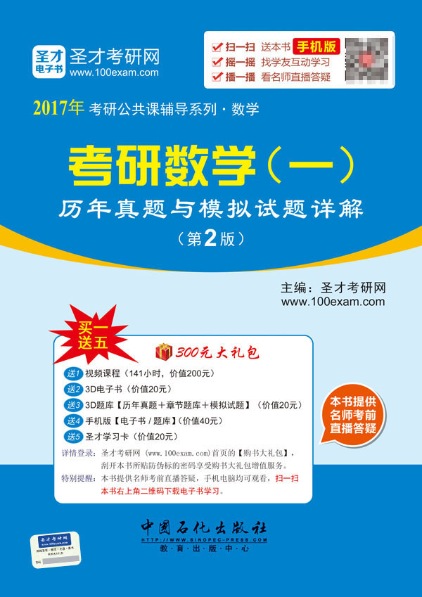 圣才考研网(www.100xuexi.com)提供考研数学辅导方案【网络课程、3D电子书、3D题库等】(详细介绍参见本书书前插页)。购书享受大礼包增值服务【200元视频课程+20元3D电子书+20元3D题库+40元手机版电子书/题库+20元圣才学习卡】。扫一扫本书封面的二维码,可免费下载本书手机版;摇一摇本书手机版,可找到所有学习本书的学友,交友学习两不误;本书提供名师考前直播答疑,手机电脑均可观看,直播答疑在考前推出(具体时间见网站公告)。