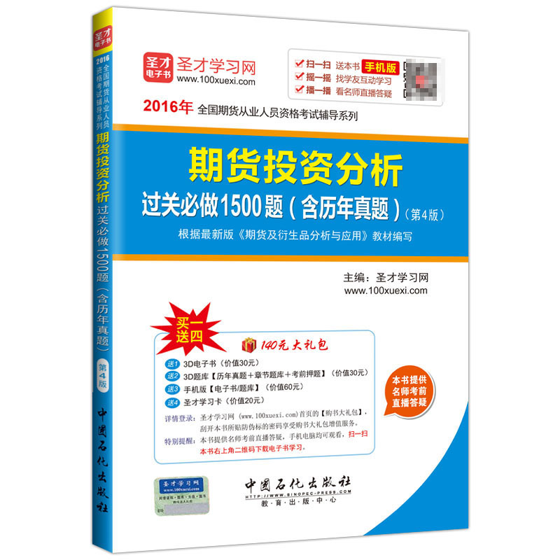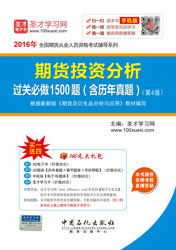 圣才学习网(www.100xuexi.com)提供全国期货从业人员资格考试等各种考试辅导方案【网络课程、3D电子书、3D题库等】(详细介绍参见本书书前彩页)。购书享受大礼包增值服务【30元3D电子书+30元3D题库+60元手机版电子书/题库+20元圣才学习卡】。扫一扫本书封面的二维码,可免费下载本书手机版;摇一摇本书手机版,可找到所有学习本书的学友,交友学习两不误;本书提供名师考前直播答疑,手机电脑均可观看,直播答疑在考前推出(具体时间见网站公告)。
