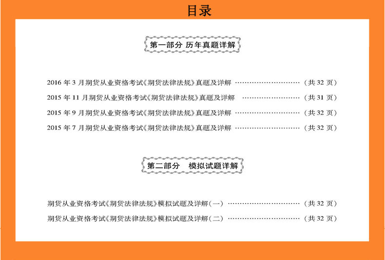 本书是全国期货从业人员资格考试科目《期货法律法规》的历年真题与模拟试题详解。全书由两部分组成:第一部分为历年真题详解,精选了2015~2016年的4套真题,并对全部真题的答案进行了详细的分析和说明;第二部分为模拟试题详解,按照2016年考试大纲及近年考试真题的命题规律精心编写了2套模拟试题,并根据2016年指定教材对所有试题进行了详细的分析和说明。