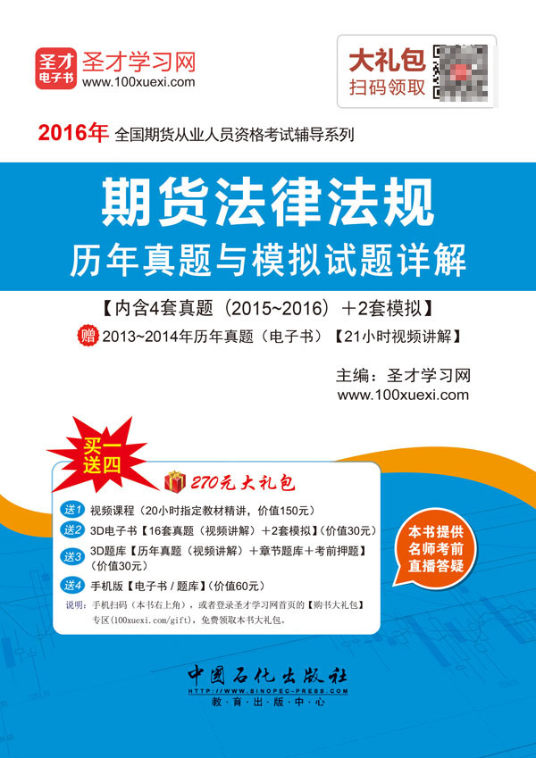 圣才学习网(www.100xuexi.com)提供全国期货从业人员资格考试辅导方案【视频课程、3D电子书、3D题库等】。购书享受大礼包增值服务【150元视频课程+30元3D电子书+30元3D题库+60元手机版电子书/题库】。本书提供名师考前直播答疑,手机电脑均可观看,直播答疑在考前推出(具体时间见网站公告)。手机扫码(本书封面的二维码),或者登录圣才学习网首页的【购书大礼包】专区(www.100xuexi.com/gift),免费领取本书大礼包。