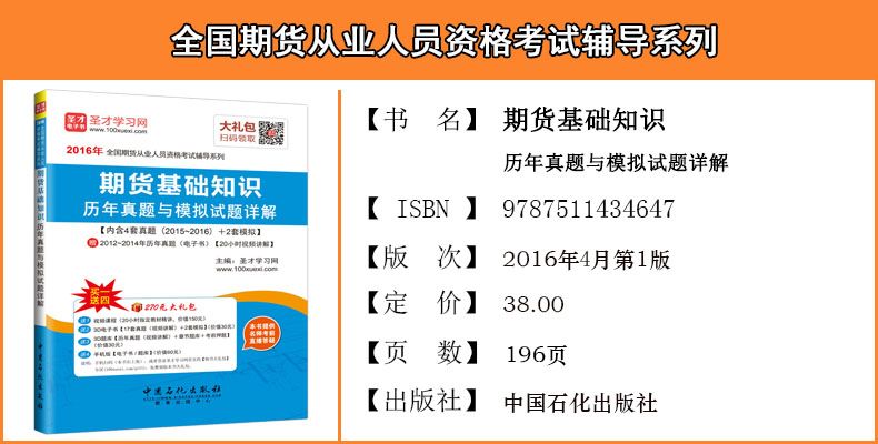 圣才学习网(www.100xuexi.com)提供全国期货从业人员资格考试辅导方案【视频课程、3D电子书、3D题库等】。购书享受大礼包增值服务【150元视频课程+30元3D电子书+30元3D题库+60元手机版电子书/题库】。本书提供名师考前直播答疑,手机电脑均可观看,直播答疑在考前推出(具体时间见网站公告)。手机扫码(本书封面的二维码),或者登录圣才学习网首页的【购书大礼包】专区(www.100xuexi.com/gift),免费领取本书大礼包。