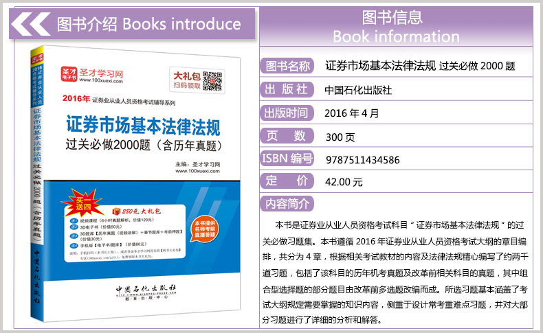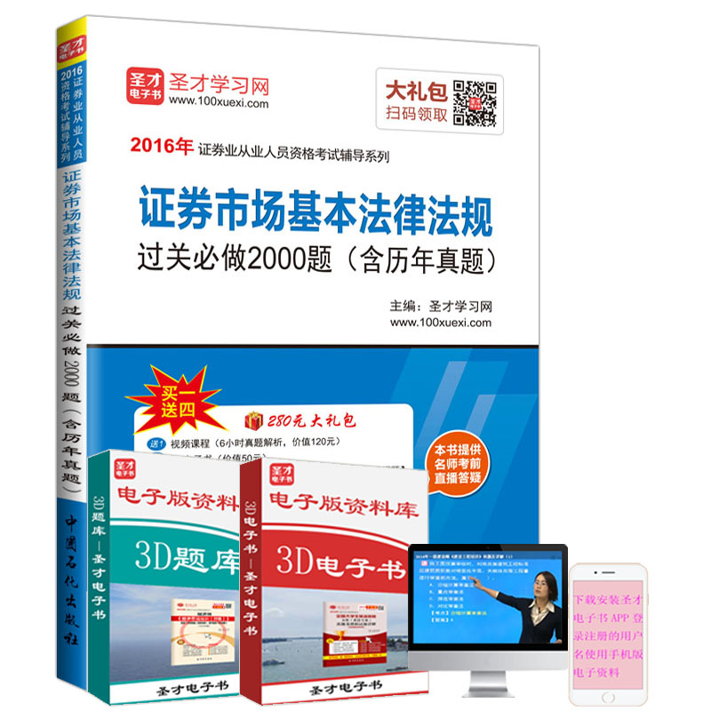 圣才学习网(www.100xuexi.com)提供证券业从业人员资格考试辅导方案【视频课程、3D电子书、3D题库等】。购书享受大礼包增值服务【120元视频课程+50元3D电子书+30元3D题库+80元手机版电子书/题库】。本书提供名师考前直播答疑,手机电脑均可观看,直播答疑在考前推出(具体时间见网站公告)。手机扫码(本书封面的二维码),或者登录圣才学习网首页的【购书大礼包】专区(www.100xuexi.com/gift),免费领取本书大礼包。