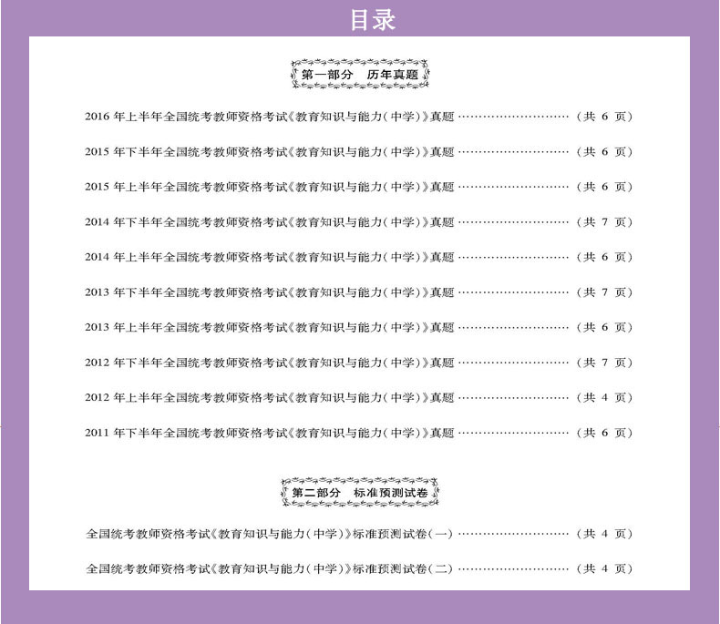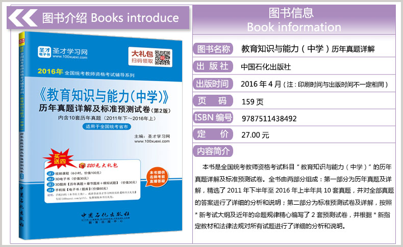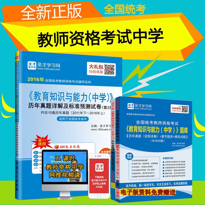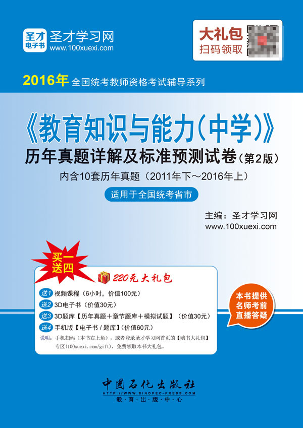 1.《综合素质(幼儿园)》历年真题详解及标准预测试卷(第2版) 2.《保教知识与能力(幼儿园)》历年真题详解及标准预测试卷(第2版) 3.《综合素质(小学)》历年真题详解及标准预测试卷(第2版) 4.《教育教学知识与能力(小学)》历年真题详解及标准预测试卷(第2版) 5.《综合素质(中学)》历年真题详解及标准预测试卷(第2版) 6.《教育知识与能力(中学)》历年真题详解及标准预测试卷(第2版) 本书是全国统考教师资格考试科目“教育知识与能力(中学)”的历年真题详解及标准预测试卷。全书由两部分组成:第一部分为历年真题及详解,精选了2011年下半年至2016年上半年共10套真题,并对全部真题的答案进行了详细的分析和说明;第二部分为标准预测试卷及详解,按照考试大纲及近年的命题规律精心编写了2套预测试卷,并根据最新指定教材和法律法规对所有试题进行了详细的分析和说明。 购买本书享受大礼包增值服务:手机扫码(本书封面的二维码),或者登录圣才学习网首页的【购书大礼包】专区(www.100xuexi.com/gift),免费领取本书大礼包。包括:①视频课程(6小时,价值100元);②3D电子书(价值30元);③3D题库【历年真题+章节题库+模拟试题】(价值30元);④手机版【电子书/题库】(价值60元)。本书提供名师考前直播答疑,手机电脑均可观看,直播答疑在考前推出(具体时间见网站公告)。 与本书相配套,圣才学习网提供全国统考教师资格考试网络课程、3D电子书、3D题库(免费下载,免费升级)。 圣才学习网(www.100xuexi.com)是一家为全国各类考试和专业课学习提供名师网络课程、3D电子书、3D题库(免费下载,送手机版)等全方位教育服务的综合性学习型视频学习网站,拥有近100种考试(含418个考试科目)、194种经典教材(含英语、经济、管理、证券、金融等共16大类),合计近万小时的面授班、网授班课程。