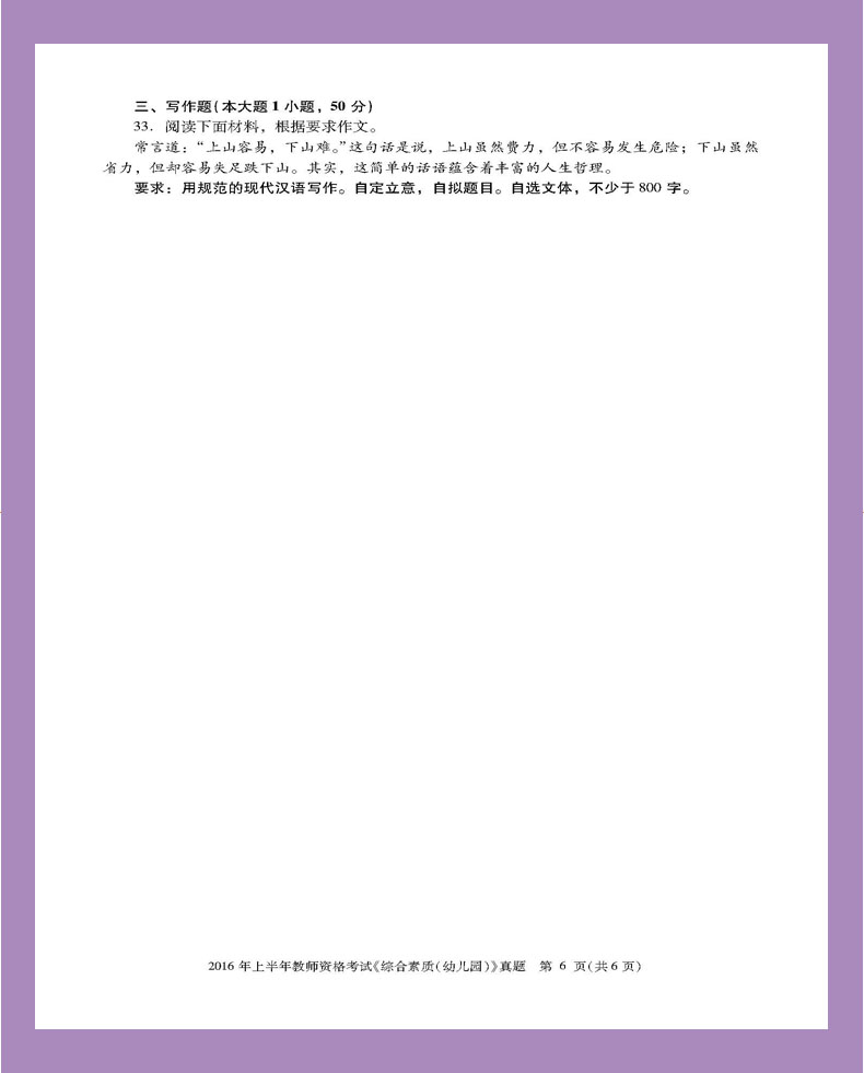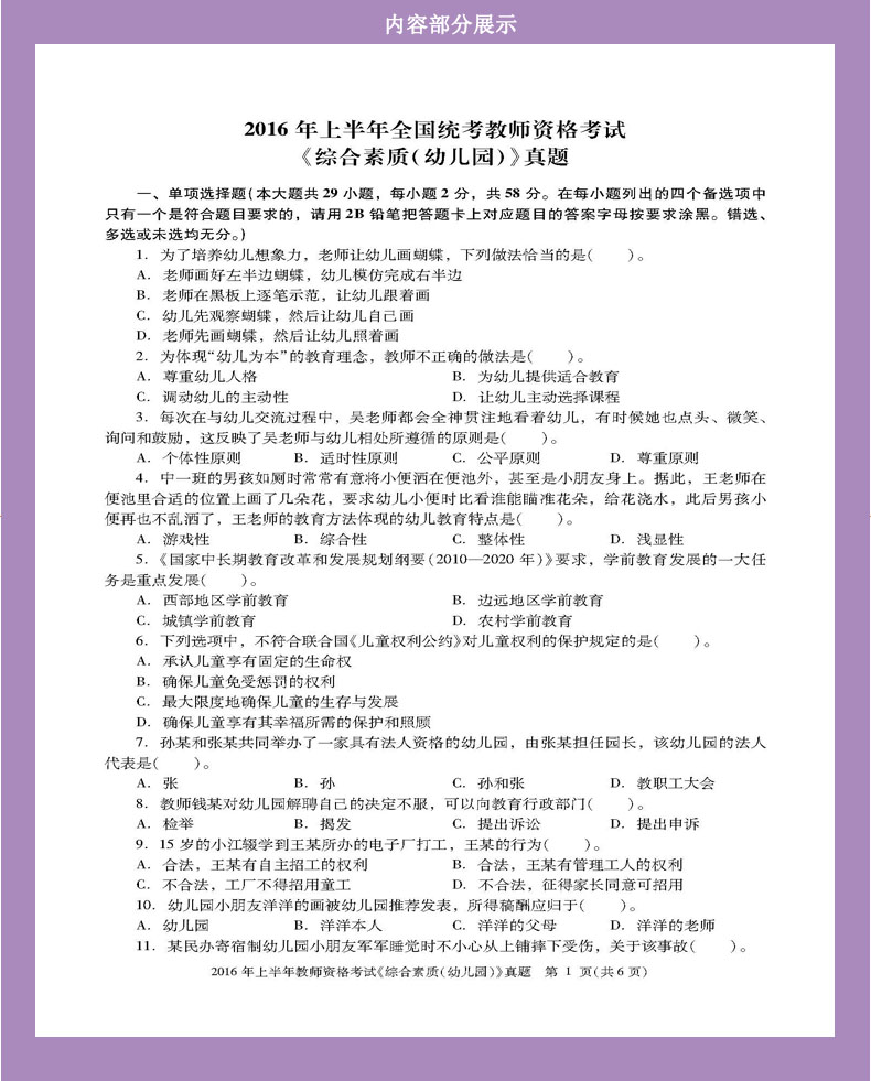 序言 为了帮助考生顺利通过全国统考教师资格考试,由长期从事全国统考教师资格考试研究的教学专家组根据2016年考试大纲和权威教材精心编写了全国统考教师资格考试辅导系列: 1.《综合素质(幼儿园)》历年真题详解及标准预测试卷(第2版) 2.《保教知识与能力(幼儿园)》历年真题详解及标准预测试卷(第2版) 3.《综合素质(小学)》历年真题详解及标准预测试卷(第2版) 4.《教育教学知识与能力(小学)》历年真题详解及标准预测试卷(第2版) 5.《综合素质(中学)》历年真题详解及标准预测试卷(第2版) 6.《教育知识与能力(中学)》历年真题详解及标准预测试卷(第2版) 本书是全国统考教师资格考试科目“综合素质(幼儿园)”的历年真题详解及标准预测试卷。全书由两部分组成:第一部分为历年真题及详解,精选了2011年下半年至2016年上半年共10套真题,并对全部真题的答案进行了详细的分析和说明;第二部分为标准预测试卷及详解,按照考试大纲及近年的命题规律精心编写了2套预测试卷,并根据最新指定教材和法律法规对所有试题进行了详细的分析和说明。 购买本书享受大礼包增值服务:手机扫码(本书封面的二维码),或者登录圣才学习网首页的【购书大礼包】专区(www.100xuexi.com/gift),免费领取本书大礼包。包括:①视频课程(6小时,价值100元);②3D电子书(价值30元);③3D题库【历年真题+章节题库+模拟试题】(价值30元);④手机版【电子书/题库】(价值60元)。本书提供名师考前直播答疑,手机电脑均可观看,直播答疑在考前推出(具体时间见网站公告)。 与本书相配套,圣才学习网提供全国统考教师资格考试网络课程、3D电子书、3D题库(免费下载,免费升级)。 圣才学习网(www.100xuexi.com)是一家为全国各类考试和专业课学习提供名师网络课程、3D电子书、3D题库(免费下载,送手机版)等全方位教育服务的综合性学习型视频学习网站,拥有近100种考试(含418个考试科目)、194种经典教材(含英语、经济、管理、证券、金融等共16大类),合计近万小时的面授班、网授班课程。