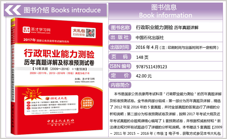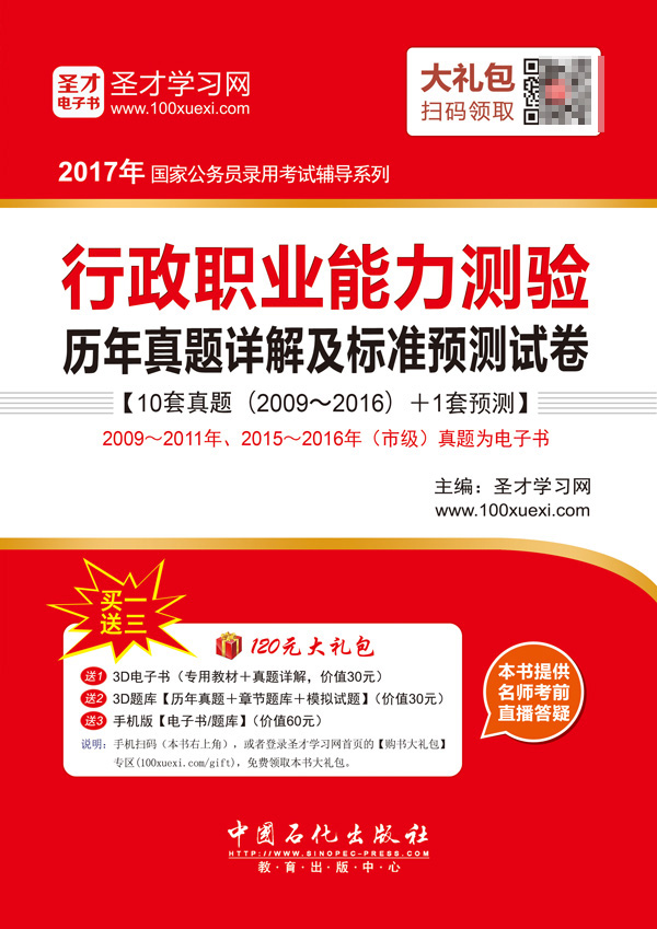 为了帮助考生顺利通过国家公务员录用考试,我们根据2017年考试大纲的考查要求编写了国家公务员录用考试辅导系列: 1.行政职业能力测验历年真题详解及标准预测试卷 2.申论历年真题详解及标准预测试卷 本书是国家公务员录用考试科目“行政职业能力测验”的历年真题详解及标准预测试卷。全书由两部分组成:第一部分为历年真题及详解,精选了2012年至2016年的5套真题,并对全部真题的答案进行了详细的分析和说明;第二部分为标准预测试卷及详解,按照2017年考试大纲及近年考试真题的命题规律精心编写了1套预测试卷,并根据权威教材和最新法律法规对所有试题进行了详细的分析和说明。本书还赠送5套真题【2009~2011年、2015~2016年(市级)】电子书,获取方式参见本书大礼包。 购买本书享受大礼包增值服务:手机扫码(本书封面的二维码),或者登录圣才学习网首页的【购书大礼包】专区(100xuexi.com/gift),免费领取本书大礼包。具体包括: ★ 3D电子书(专用教材+真题详解,价值30元); 本部分除提供本书所有纸质内容外,还提供2009~2011年、2015~2016年(市级)真题及详解,以及国家公务员考试《行政职业能力测验》专用教材【备考指南+考点精讲+典型题(含历年真题)详解】,完全按照2017年考试大纲及近年考试真题的命题重点精心编写而成。 ★ 3D题库【历年真题+章节题库+模拟试题】(价值30元); ★ 手机版【电子书/题库】(价值60元)。 本书提供名师考前直播答疑,手机电脑均可观看,直播答疑在考前推出(具体时间见网站公告)。 与本书相配套,圣才学习网提供国家公务员录用考试网络课程、3D电子书、3D题库(免费下载,送手机版)。 圣才学习网(www.100xuexi.com)是一家为全国各类考试和专业课学习提供名师网络课程、3D电子书、3D题库(免费下载,送手机版)等全方位教育服务的综合性学习型视频学习网站,拥有近100种考试(含418个考试科目)、194种经典教材(含英语、经济、管理、证券、金融等共16大类),合计近万小时的面授班、网授班课程。