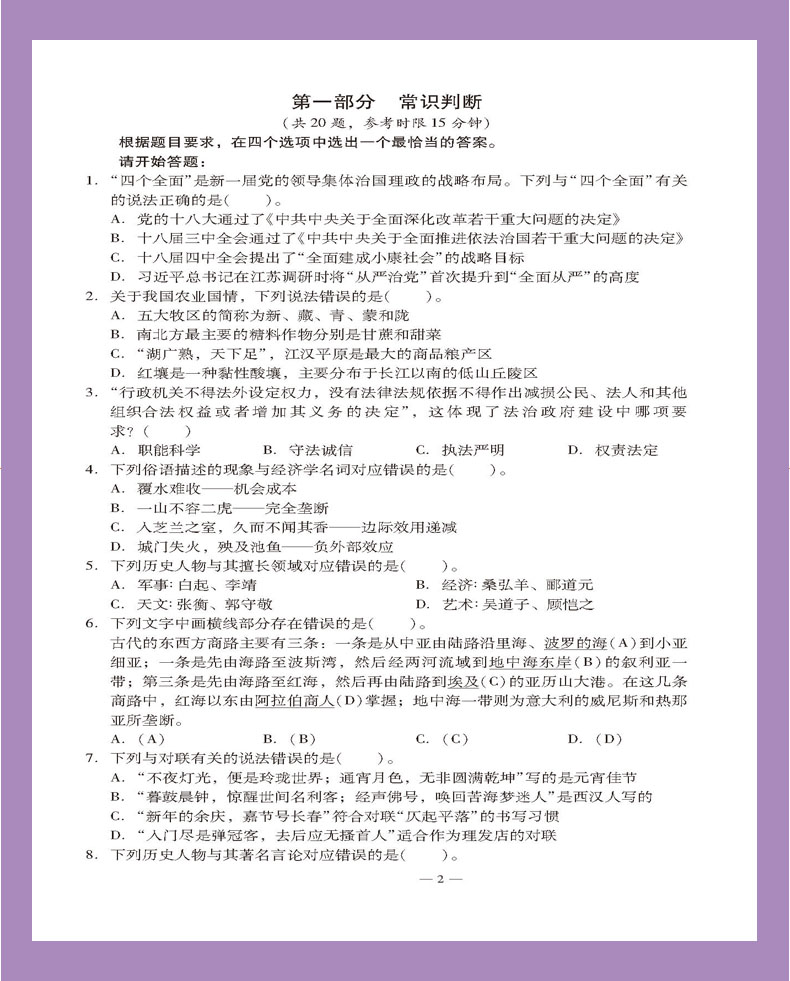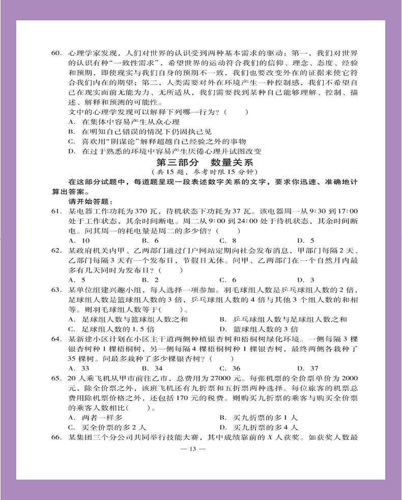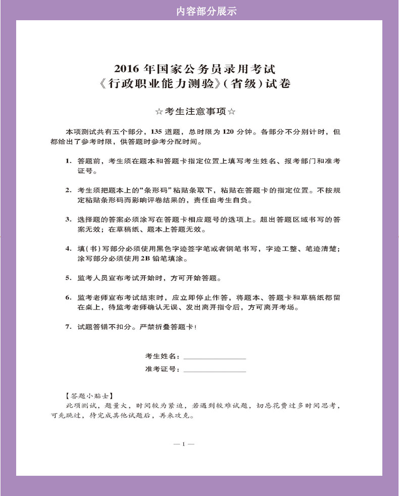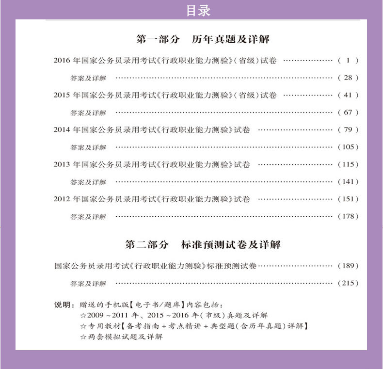 第一部分 历年真题及详解 2016年国家公务员录用考试《行政职业能力测验》(省级)试卷答案及详解 2015年国家公务员录用考试《行政职业能力测验》(省级)试卷答案及详解 2014年国家公务员录用考试《行政职业能力测验》试卷答案及详解 2013年国家公务员录用考试《行政职业能力测验》试卷答案及详解 2012年国家公务员录用考试《行政职业能力测验》试卷答案及详解 第二部分 标准预测试卷及详解 国家公务员录用考试《行政职业能力测验》标准预测试卷答案及详解