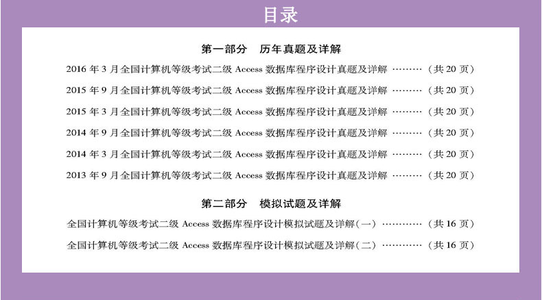 本书是全国计算机等级考试二级“Access数据库程序设计”的历年真题与模拟试题详解。全书由两部分组成:第一部分为历年真题及详解,精选了2016年3月至2013年9月共6套真题,并对全部真题的答案进行了详细的分析和说明;第二部分为模拟试题及详解,按照最新考试大纲及近年的命题规律精心编写了2套模拟试题,并根据最新指定教材和法律法规对所有试题进行了详细的分析和说明。本书还赠送10套真题【2008年9月~2013年3月】电子书,获取方式参见本书大礼包。