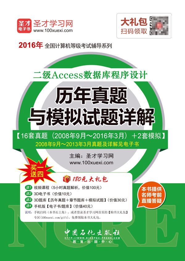 圣才学习网(www.100xuexi.com)提供全国计算机等级考试辅导方案【网络课程、3D电子书、3D题库等】。购书享受大礼包增值服务【100元视频课程+10元3D电子书+30元3D题库+40元手机版电子书/题库】。本书提供名师考前直播答疑,手机电脑均可观看,直播答疑在考前推出(具体时间见网站公告)。手机扫码(本书封面的二维码),或者登录圣才学习网首页的【购书大礼包】专区(www.100xuexi.com/gift),免费领取本书大礼包。