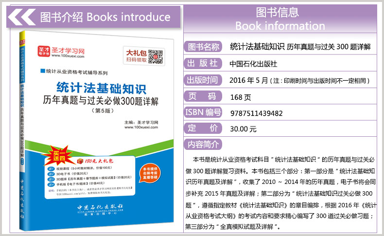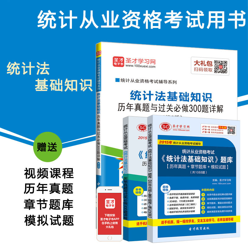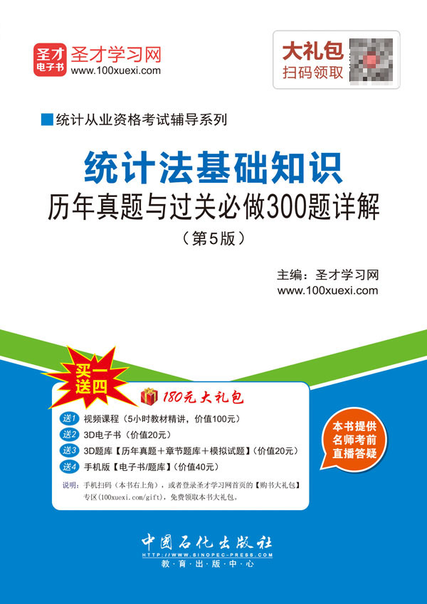 圣才学习网(www.100xuexi.com)提供统计从业资格考试辅导方案【视频课程、3D电子书、3D题库等】。购书享受大礼包增值服务【100元视频课程+20元3D电子书+20元3D题库+40元手机版电子书/题库】。本书提供名师考前直播答疑,手机电脑均可观看,直播答疑在考前推出(具体时间见网站公告)。手机扫码(本书封面的二维码),或者登录圣才学习网首页的【购书大礼包】专区(www.100xuexi.com/gift),免费领取本书大礼包。