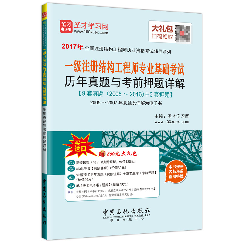 圣才学习网(www.100xuexi.com)提供一级注册结构工程师等各种职称资格考试辅导方案【视频课程、3D电子书、3D题库等】。购书享受大礼包增值服务【120元视频课程+30元3D电子书+40元3D题库+70元手机版电子书/题库】。本书提供名师考前直播答疑,手机电脑均可观看,直播答疑在考前推出(具体时间见网站公告)。手机扫码(本书封面的二维码),或者登录圣才学习网首页的【购书大礼包】专区(www.100xuexi.com/gift),免费领取本书大礼包。